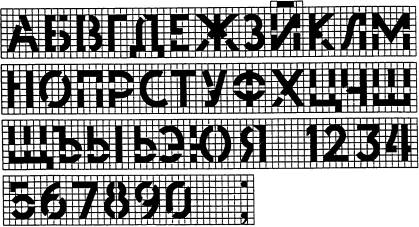I - марка конструкции; 2 - товарный знак или краткое наименование предприятия-изготовителя; 3 - штамп ОТК; 4 - дата изготовления конструкции; 5 - масса конструкции ПРИЛОЖЕНИЕ 2РекомендуемоеШРИФТ ДЛЯ МАРКИРОВКИ 1. При нанесении маркировки окраской по трафарету шрифт должен соответствовать указанному на чертеже. 2. Расстояние между буквами и цифрами должно быть не менее 1/6 их высоты, за исключением таких сочетаний, как Р и А, Ф и Т, Г и Д, на которых расстояние должно быть установлено зрительно равным с остальными. Расстояние между словами должно быть не менее 1/2 высоты букв и цифр. Расстояние между основаниями строк должно быть не менее 3/2 высоты букв и цифр. 3. Ширина перемычек букв и цифр должна быть равна 1/6 высоты букв и цифр. Допускается уменьшать число перемычек для трафаретов из металла и других прочих материалов и изменять их место. 4. При нанесении маркировки другими способами следует применять типографские шрифты по нормативно-технической документации.