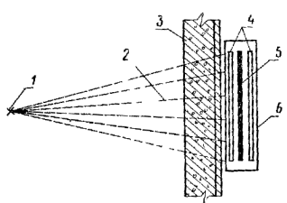 расположении арматуры; Черт. 4. 4. ОБРАБОТКА РЕЗУЛЬТАТОВ4.1. Снимки контролируемой конструкции получают путем фотообработки радиографической пленки по окончании просвечивания. Фотообработка включает в себя проявление пленки, ее промежуточную и окончательную промывку, фиксирование и сушку. 4.2. Снимки считают годными для расшифровки, если они удовлетворяют следующим требованиям: на пленке видно изображение всего контролируемого участка конструкции; на пленке видны изображения всех ограничительных меток, маркировочных знаков и эталона чувствительности; плотность потемнения снимка находится в интервале 1,2 - 3,0 единиц оптической плотности; на пленке не имеется пятен, полос и повреждений эмульсионного слоя, затрудняющих возможность определения толщины защитного слоя бетона, размеров и расположения арматуры и закладных деталей. 4.3. Расшифровку снимков производят в затемненном помещении на осветителях-негатоскопах с регулируемой яркостью освещенного поля. 4.4. Толщину защитного слоя бетона, размеры и расположение арматуры и закладных деталей определяют по снимку при помощи прозрачной линейки. 4.5. Толщину защитного слоя бетона В, мм, при просвечивании конструкции со смещением источника излучения рассчитывают по формуле