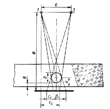 где Ф - фокусное расстояние, мм; С - расстояние между первым и вторым положением источника, мм; C1 - смещение арматурного стержня на снимке, мм; D - диаметр арматурного стержня, мм. 4.6. Диаметр арматурного стержня D, мм, вычисляют по формуле