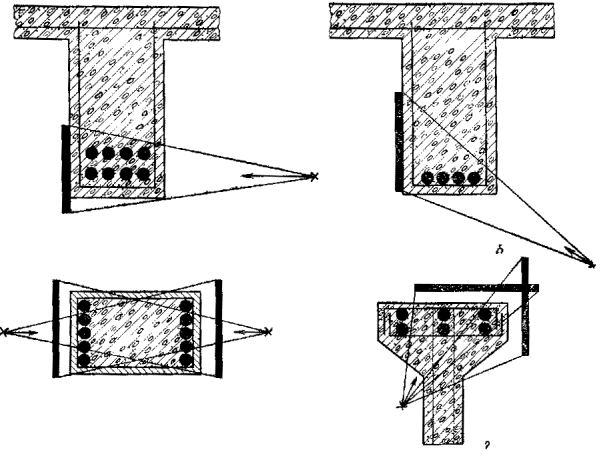 стержня; В - толщина защитного слоя; Черт. 3. 3.11. Примерные схемы просвечивания железобетонных конструкций представлены на черт. 4. а - балка ребристого перекрытия при двухрядном