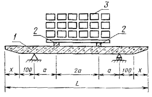 1 - испытуемая плита; 2 - деревянные брусья сечением 10´10 см; 3 - нагрузка на всю ширину плиты Черт. 4 Таблица 4