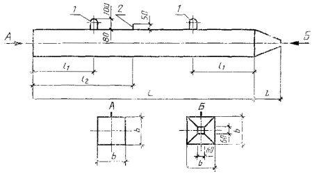 Постановлением Государственного комитета СССР по делам строительства от 24 октября 1979 г. № 208 срок введения установлен с 01.01.81 * Переиздание (май 1995 г.) с Изменением № 1, утвержденным в июне 1983 г.; Пост. №54 от 31.03.83 (ИУС 9-83) 1. Настоящий стандарт распространяется на забивные железобетонные цельные сваи сплошного квадратного сечения с поперечным армированием ствола с напрягаемой арматурой и устанавливает конструкцию свай и арматурных изделий к ним. 2. Железобетонные сваи сплошного квадратного сечения с напрягаемой продольной арматурой должны удовлетворять требованиям ГОСТ 19804-91 и требованиям настоящего стандарта. 3. Форма, марки, номинальные размеры свай и проектные марки бетона по прочности на сжатие должны соответствовать указанным на черт. 1 и в табл. 1. Сваи сплошного квадратного сечения с поперечным армированием ствола с напрягаемой продольной арматурой 1 - подъемные петли; 2 - штырь для фиксации места строповки при подъеме на копер Черт. 1 Таблица 1