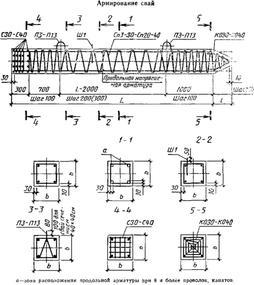 Допускается увеличивать поперечное сечение продольной арматуры, если это требуется по расчету. При этом в конце марки сваи добавляется буква «у» (усиленная) и в заказной спецификации дополнительно указывается класс, диаметр и количество стержней продольной арматуры.