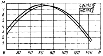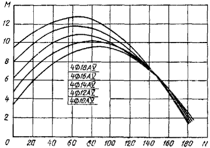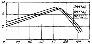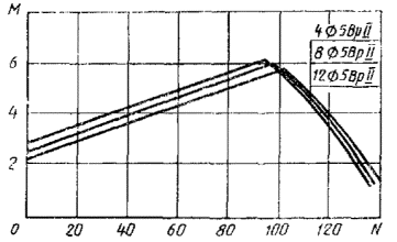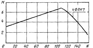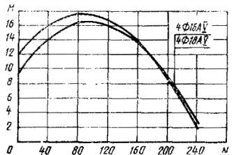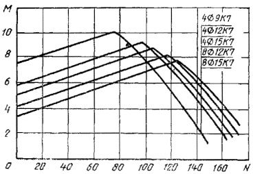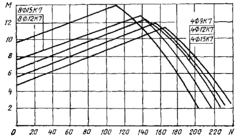 7. Если точка с координатами М и N лежит ниже линии, соответствующей принятому армированию свай, то выбранная свая удовлетворяет расчету по прочности, раскрытию или образованию трещин (для соответствующей продольной арматуры) на эксплуатационные нагрузки М и N, если точка лежит выше - не удовлетворяет.
