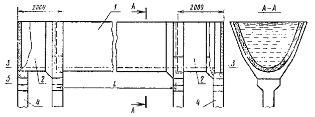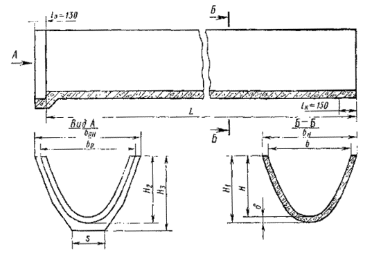 Постановлением Государственного комитета Совета Министров СССР по делам строительства от 31 декабря 1975 г. № 247 срок введения установлен с 01.01.77 Настоящий стандарт распространяется на железобетонные раструбные лотки параболического сечения, изготовляемые из тяжелого бетона средней плотностью 2200-2500 кг/м3 включительно и предназначенные для устройства сборных распределительных каналов оросительных систем на расход воды до 5 м3/с. Установленные настоящим стандартом показатели технического уровня предусмотрены для лотков первой категории качества. (Измененная редакция, Изм. № 1). 1. ТИПЫ, МАРКИ И РАЗМЕРЫ1.1. По условиям эксплуатации железобетонные параболические лотки подразделяют на следующие типы: ЛР - лотки, сооружаемые на сваях, стоечных опорах и плитах; ЛРГ - лотки, укладываемые в грунт. Форма, основные размеры и показатели материалоемкости (расход бетона и стали) лотков должны соответствовать указанным на черт. 1 и в табл. 1. Черт. 1 Таблица 1