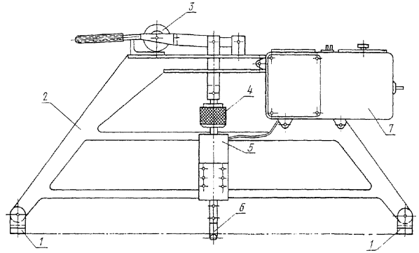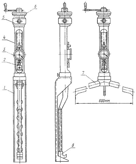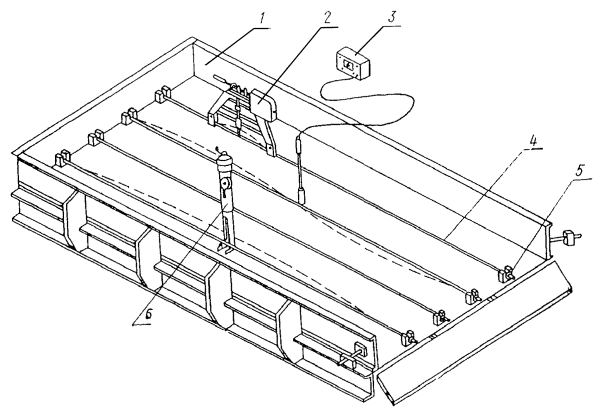 1 - форма; 2 - прибор ПИН; 3 - прибор ИПН-7; 4 - арматура; 5 - упоры; 6 - прибор ПРДУ 7. ЧАСТОТНЫЙ МЕТОД ИЗМЕРЕНИЯ СИЛЫ НАТЯЖЕНИЯ АРМАТУРЫ7.1. Частотный метод основан на зависимости между напряжением в арматуре и частотой ее собственных поперечных колебаний, которые устанавливаются в натянутой арматуре через определенное время после выведения ее из состояния равновесия ударом или каким-либо другим импульсом. 7.2. Для измерения силы натяжения арматуры частотным методом применяют прибор ИПН-7 (без собственной базы). 7.3. Прибором ИПН-7 измеряют число колебаний натянутой арматуры за определенное время, по которым определяют силу натяжения с учетом градуировочной характеристики для данного класса, диаметра и длины арматуры. 7.4. Применяемые приборы должны обеспечивать измерение частоты собственных колебаний арматуры с погрешностью, не превышающей ±1,5%. 7.5. Относительная погрешность определения силы натяжения арматуры не должна превышать ±4%. 7.6. Место установки частотных приборов должно находиться от источника электрических помех на расстоянии не менее 5 м. 7.7. Первичный измерительный преобразователь при измерении силы натяжения арматуры приборами без собственной базы должен размещаться на участке арматуры, отстоящем от середины ее длины на расстоянии, не превышающем 2%. Контролируемая арматура вдоль всей ее длины при колебании не должна соприкасаться со смежными арматурными элементами, закладными деталями и формой. 8. ОПРЕДЕЛЕНИЕ ГРАДУИРОВОЧНЫХ ХАРАКТЕРИСТИК ПРИБОРОВ8.1. Определение градуировочных характеристик приборов осуществляют путем сопоставления показаний прибора с заданной силой, фиксируемой по показаниям динамометра с классом точности не ниже 1,0, установленного последовательно с натягиваемой арматурой. Определение градуировочных характеристик манометров допускается осуществлять без арматуры путем сопоставления показаний манометра и образцового динамометра, установленного последовательно с гидравлическим домкратом. 8.2. При градуировке приборов максимальная сила натяжения арматуры должна превышать номинальную проектную силу натяжения арматуры на величину допускаемого положительного отклонения. Минимальная сила должна составлять не более 50% номинального проектного значения. Количество этапов нагружения должно быть не менее 8, а количество измерений на каждом этапе - не менее 3. 8.3. При максимальной силе натяжения арматуры показание образцового динамометра должно составлять не менее 50% его шкалы. 8.4. Определение градуировочных характеристик приборов, применяемых для измерения силы натяжения арматуры методом поперечной оттяжки и частотным методом 8.4.1. Определение градуировочных характеристик приборов должно производиться для каждого класса и динамометра арматуры, а для приборов без собственной базы - для каждого класса, диаметра и длины арматуры. 8.4.2. Длина арматурных элементов, силу натяжения в которых измеряют приборами с собственной базой, должна превышать длину базы прибора не менее чем в 1,5 раза. 8.4.3. При измерении силы натяжения арматуры приборами без собственной базы: длина арматурных элементов при градуировке не должна отличаться от длины контролируемых элементов более чем на 2%; отклонение места размещения прибора или датчика прибора от середины длины арматуры не должно превышать 2% длины арматуры для 