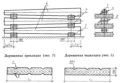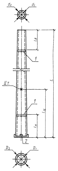 1 - опорные диафрагмы; 2 - подпятник; 3 - коротыши; 4 - цементный раствор; ц.т. - центр тяжести стойки; L - длина стойки; lц - расстояние до центра тяжести стойки; lн, lв - расстояния до мест установки опорных диафрагм; D1 - внутренний диаметр стойки; D2 - наружный диаметр стойки Черт. 2 До пересмотра типовых проектов допускается применять марки в соответствии с действующей проектной документацией. Примеры условного обозначения (марки) конической стойки (типа СК) длиной 26000 мм и сечением 1, второй несущей способности, с напрягаемой продольной арматурой из арматурных канатов класса К-7 (при смешанном армировании): СК 26.1-2.3 конической стойки (типа СК) длиной 22600 мм и сечением 3, первой несущей способности, с напрягаемой продольной арматурой из арматурной стали класса A-VI; СК 22.3-1.2 цилиндрической стойки (типа СЦ) длиной 20000 мм и сечением 3, первой несущей способности, с напрягаемой продольной арматурой из арматурной стали класса A-IV; СЦ 20.3-1.0 Таблица 1
