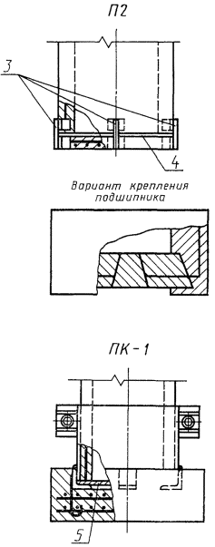 1 - опорные диафрагмы; 2 - подпятник; 3 - коротыши; 4 - цементный раствор; ц.т. - центр тяжести стойки; L - длина стойки; lц - расстояние до центра тяжести стойки; lн, lв - расстояния до мест установки опорных диафрагм; D2, d2 - наружные диаметры стойки; D1, d1 - внутренние диаметры стойки; 5 - асбестовый лист D = 410 mm, d = 10 мм. Черт. 1 Цилиндрическая стойка Узлы крепления подпятников