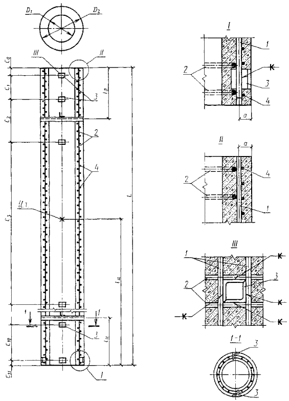 При вычислении массы изделия средняя плотность бетона принята 2500 кг/м3. Два монтажных кольца по концам стойки следует приварить ко всем стержням ненапрягаемой продольной арматуры. Примечание. На развертках арматурных каркасов монтажные кольца показаны поперечными линиями. 13. Спецификация арматурных элементов на стойку приведена в табл. 3. 14. Расстояния между закладными изделиями по длине стойки приведены в табл. 5. 15. Фланцевые соединения секций стоек СЦ20.3-1.1н и СЦ20.3-1.1в, СЦ20.3-1.0н и СЦ20.3-1.0в должны соответствовать указанным на черт. 23 и 24. 16. Конструкция закладных изделий, а также подпятников стоек приведена в ГОСТ 22687.3-85. 17. Схемы опирания и загружения стоек при испытании нагружением по прочности, жесткости и трещиностойкости приведены в обязательном приложении 1. 18. Значения контрольной нагрузки по проверке прочности, жесткости и трещиностойкости при испытании по схеме нормального режима, а также значения контрольного прогиба и контрольной ширины раскрытия трещин указаны в обязательном приложении 2. 19. Значения контрольной нагрузки при испытании по схеме аварийного режима приведены в обязательном приложении 1. 1 - продольная арматура; 2 - монтажные кольца; 3 - закладные изделия; 4 - спираль: а - расстояние от наружной поверхности стойки до оси продольной арматуры; с0-с3, с10-с11 - привязка закладных изделий; ц. т. - центр тяжести; L - длина стойки; lц - расстояние до центра тяжести; lн, lв - расстояния до мест установки диафрагм; D1 - внутренний диаметр стойки; D2 - наружный диаметр стойки Черт. 1 Таблица 2