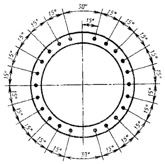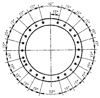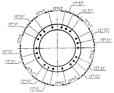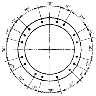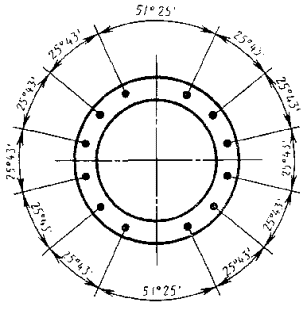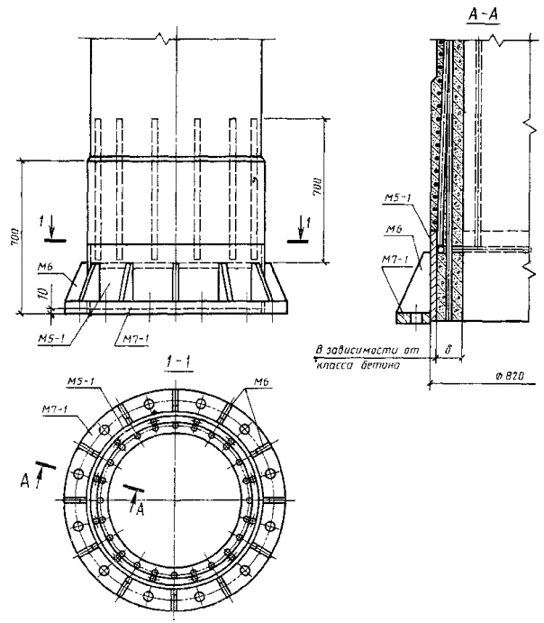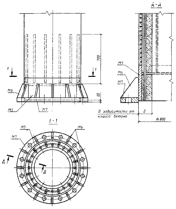 Примечания: 1. Размещение закладных изделий для одинаковых стоек с разным армированием одинаково, поэтому в марках стоек опущена последняя цифра. 2. Стойка СЦ26.2-1 не имеет закладных изделий для сквозных болтов. Торец стоек СЦ20.3-1в и СЦ20.3-1н с фланцем из труб по ГОСТ 10704-76 Количество марок на одну стойку: М5-1 ... 1 шт. М6 ... 12 шт. М7-1 ... 1 шт. Черт. 23 Торец стоек СЦ20.3-1в и СЦ20.3-1н с фланцем из вальцованной трубы Количество марок на одну стойку: М5 . . . 1 шт. Мб ... 12 шт. М7 . . . 1 шт. Черт. 24 ПРИЛОЖЕНИЕ I