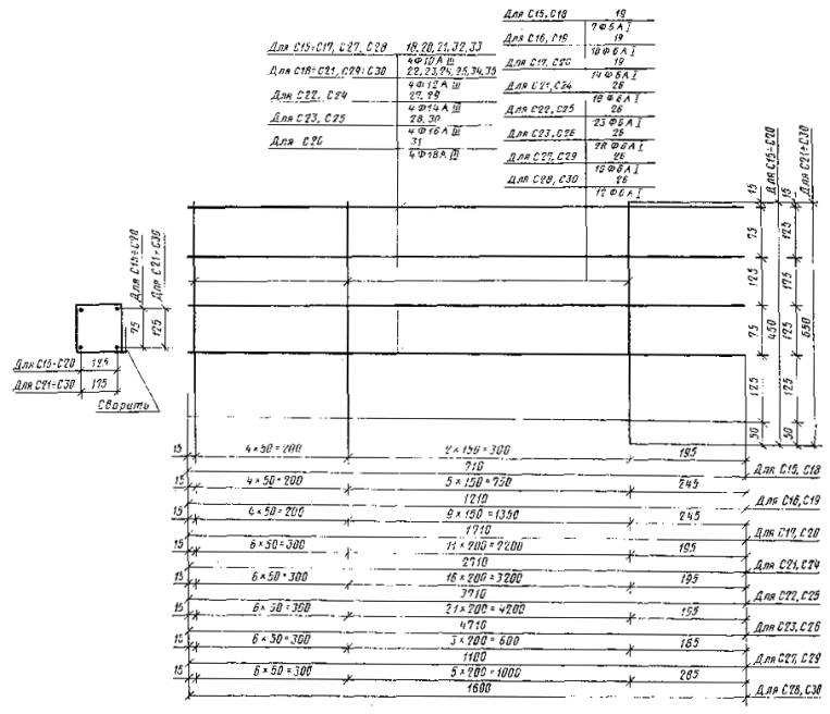 Примечание. В числителе дана масса арматуры колонн под лотки длиной 6 м, а в знаменателе - под лоток длиной 8 м. 2. ТЕХНИЧЕСКИЕ ТРЕБОВАНИЯ2.1. Колонны под лотки должны изготовляться в соответствии с требованиями настоящего стандарта. 2.2. Бетон 2.2..1. Материалы, применяемые для приготовления бетона, должны обеспечивать выполнение технических требований, установленных настоящим стандартом, и соответствовать действующим стандартам или техническим условиям на эти материалы. 2.2.2. Колонны под лотки должны изготовляться из тяжелого бетона марки не ниже М 200. 2.2.3. Водопоглощение бетона колонн должно быть не более 5%. 2.2.4. Марка бетона колонн по водонепроницаемости должна быть В2. 2.2.5. Марка бетона колонн по морозостойкости должна приниматься в соответствии с требованиями главы СНиП II-21-75 в зависимости от климатических условий района строительства, указанному в заказе на изготовление колонн, но не менее Мрз 100. 2.2.6. Поставка колонн потребителю должна производиться после достижения бетоном отпускной прочности, назначаемой с учетом технологии их изготовления, условий транспортирования и монтажа, срока загружения колонн нагрузкой, а также с учетом возможности дальнейшего нарастания прочности бетона в конструкции в зависимости от климатических условий района строительства и времени года. Величина отпускной прочности бетона должна быть не менее: свай-колонн-100% проектной марки бетона по прочности на сжатие; стоек-колонн-70% проектной марки бетона по прочности на сжатие. Назначение и согласование величины отпускной прочности бетона - по ГОСТ 13015-75. 2.2.7. Бетон, а также материалы для приготовления бетона колонн, предназначенных для работы в условиях воздействия агрессивной среды, должны удовлетворять требованиям главы СНиП II-28-73. 2.3. Арматура и арматурные изделия 2.3.1. Для армирования колонн должна применяться арматурная сталь следующих видов и классов: рабочая арматура - горячекатаная арматурная сталь периодического профиля класса A-III по ГОСТ 5781-75 и ГОСТ 5.1459-72; конструктивная арматура - горячекатаная арматурная гладкая сталь класса A-I по ГОСТ 5781-75. 2.3.2. Сварные арматурные изделия должны удовлетворять требованиям ГОСТ 10922-75. 2.3.3. Монтажные петли должны изготавливаться из стержневой горячекатаной гладкой арматуры класса A-I марок ВСтЗпс2, ВСтЗсп2 по ГОСТ 5781-75. Сталь марки ВСтЗпс2 не допускается применять для монтажных петель, предназначенных для подъема и монтажа колонн при температуре ниже минус 40°С. 2.3.4. Армирование колонн под лотки должно соответствовать обязательному приложению 1. 2.3.5. Толщина защитного слоя бетона для рабочей арматуры должна быть не менее 30 мм. 2.4. Изготовление колонн 2.4.1. Колонны следует изготовлять в стальных формах, удовлетворяющих требованиям ГОСТ 18886-73. 2.4.2. Проектное положение арматурных изделий и толщину защитного слоя бетона следует фиксировать прокладками из плотного цементно-песчаного раствора или пластмассовыми фиксаторами. Применение стальных фиксаторов не допускается. 2.4.3. Отклонения от проектных размеров колонн, положения арматуры, расположения подъемных петель, а также от проектной толщины защитного слоя бетона не должны превышать в мм: по длине призматической части и общей длине сваи-колонны …...... ±30 по длине стойки-колонны ....……………………………………...…… ±10 по размерам поперечного сечения ……………………………...