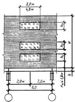 * С промежуточным креплением ленточного остекления к колоннам каркаса через 3,0 м по высоте. ** В скобках даны значения H и H0 при высоте слоя кладки над балкой до проема Hк = 1,8 м. Примечания: 1. Кладка для стен зданий с расчетной сейсмичностью 7-9 баллов должна быть не ниже 2-й категории по СНиП II-7-81 и иметь гибкие связи с каркасом здания. 2. При расчетной сейсмичности 7 и 8 баллов высоты кладки принимаются такими же, как для зданий без учета сейсмичности по табл. 1. а) глухая стена (без проемов)