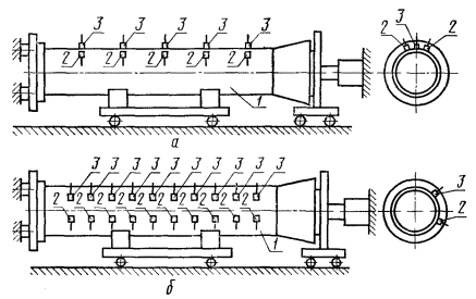 Постановлением Государственного комитета СССР по делам строительства от 29 сентября 1981 г. № 167 срок введения установлен с 01.07 1982 г. Настоящий стандарт распространяется на железобетонные предварительно напряженные напорные раструбные трубы и устанавливает ультразвуковой метод контроля и оценки трещиностойкости при испытании труб на водонепроницаемость. При применении ультразвукового метода испытания на трещиностойкость указанных труб по ГОСТ 12586-74 и ГОСТ 16953-78 проводить не следует. 1. ОБЩИЕ ПОЛОЖЕНИЯ1.1. Контроль трещиностойкости труб ультразвуковым методом осуществляют одновременно с испытаниями их на водонепроницаемость по ГОСТ 12586.0. (Измененная редакция. Изм. № 1) 1.2. Метод основан на связи между изменением скорости распространения ультразвука в бетоне под воздействием внешней нагрузки - испытательного давления Р и трещиностойкостью трубы. 1.3. Основные термины, применяемые в настоящем стандарте, приведены в справочном приложении 1. 2. АППАРАТУРА2.1. Аппаратура для контроля трещиностойкости труб состоит из ультразвуковой установки и манометров для измерения испытательного давления воды в трубе. Ультразвуковая установка состоит из ультразвукового прибора для измерения времени распространения ультразвука в бетоне, комплекта ультразвуковых преобразователей и коммутирующего устройства, удовлетворяющих требованиям пп. 2.2, 2.3. Технические характеристики ультразвуковых установок «Бетон-17» и НЗМ002 приведены в приложении 2. (Измененная редакция Изм. № 1) 2.2. Предельная допустимая относительная погрешность измерения времени распространения ультразвука не должна превышать 1 %. Дискретность отсчета ультразвукового прибора должна быть не более 0,1 мкс. 2.3. Коммутирующее устройство должно обеспечивать возможность измерения времени распространения ультразвука не менее чем по 10 каналам. 2.4. Манометры для измерения испытательного давления должны удовлетворять требованиям I класса точности по ГОСТ 2405 при верхнем пределе шкалы не более 6 МПа. (Измененная редакция Изм. № 1) 3. ПОДГОТОВКА К ИСПЫТАНИЮ3.1. Контроль трещиностойкости производят на испытательном стенде для определения водонепроницаемости по ГОСТ 12586.0. (Измененная редакция Изм. № 1) 1 - труба; 2 - излучатели; 3 - приемники 3.2. Для контроля и оценки трещиностойкости труб Рт предварительно устанавливают для каждой марки зависимость в виде уравнения где P1 и P2 - расчетные испытательные давления; а1 и а2 - коэффициенты зависимости, методика определения которых приведена в обязательном приложении 3. (Измененная редакция Изм. № 1) Пример расчета величин P1 и P2 и коэффициентов зависимости а1 и а2 приведен в справочном приложении 4. 3.3. Ультразвуковые преобразователи наклеивают на внешней поверхности трубы с помощью легкоплавкой смеси (битум или смесь парафина и канифоли в соотношении 1:1). Допускается использование специальных прижимных устройств для обеспечения надежного акустического контакта между поверхностями преобразователей и бетоном. 3.4. Расстояние между каждой парой ультразвуковых преобразователей (излучатель - приемник), образующих канал измерения, должно составлять (45 ± 5) см. Рекомендуемые схемы установки преобразователей приведены на чертеже. Расположение преобразователей должно быть одинаковым при установлении зависимости (1) и при проведении испытания труб. 4. ПРОВЕДЕНИ