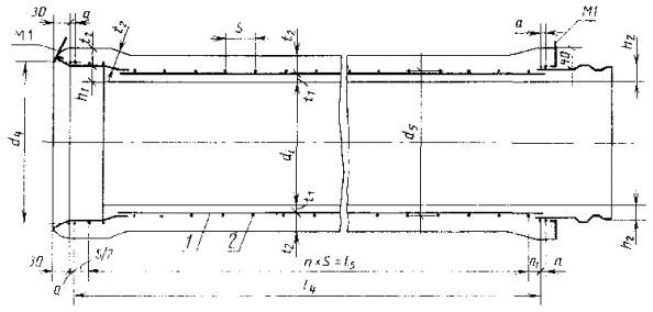 6.3.5. Подкладки под трубами и прокладки между ними в штабеле следует располагать на расстоянии 0,2 длины труб от их торцов. 6.3.6. Стальные сердечники труб следует хранить в штабелях или на специальных стеллажах в сухих помещениях под навесом. Не допускается попадание на них влаги. 7. УКАЗАНИЯ ПО ПРИМЕНЕНИЮ7.1. Трубы следует укладывать ниже расчетной глубины промерзания грунта. ПРИЛОЖЕНИЕ 1Обязательное КОНСТРУКЦИЯ ТРУБ1. Армирование труб должно соответствовать указанному на черт. 1 и в табл. 1. Для труб диаметрами условного прохода 400-600 мм при толщине стенки цилиндра сердечника 1,5-1,8 мм шаг спиральной арматуры следует принимать по табл. 14. 2. Форма и размеры стального сердечника трубы должны соответствовать указанным на черт. 2 и в табл. 2. 3. Форма и размеры элементов сердечника должны соответствовать указанным: раструба - на черт. 3 и в табл. 3; цилиндра - на черт. 4 и в табл. 4; втулки - на черт. 5 и в табл. 5. 4. Спецификация и выборка стали на спиральную арматуру приведены в табл. 6. 5. Форма и размеры закладных изделий M1 должны соответствовать указанным на черт. 6. Установка закладных изделий M1 в трубе приведена на черт. 7. Спецификация и выборка стали на закладные изделия M1 приведены в табл. 8. 6. Ведомость расхода стали на одну трубу приведена в табл. 9. Для труб диаметрами условного прохода 400-600 мм при толщине стенки цилиндра сердечника 1,5-1,8 мм ведомости расхода стали на одну трубу приведены в табл. 10-13. Армирование труб Разрез по продольной оси трубы 1 - стальной сердечник; 2 - спиральная напрягаемая арматура; t1 - толщина бетонного слоя Черт. 1 Таблица 1 Размеры труб Размеры в мм