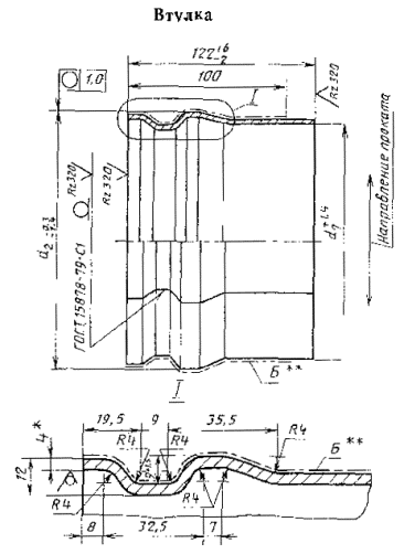Примечания: 1. Цилиндр для труб диаметрами условного прохода 250 и 300 мм принят из стали толщиной 1,5 мм, для труб диаметрами условного прохода 400-600 мм - из стали толщиной 2 мм. 2. Масса цилиндра дана с учетом сварки внахлест. * Размер для справок. ** Б - поверхность, подвергаемая металлизации. Черт. 5 (Измененная редакция, Изм. № 1). Таблица 5 Размеры втулки Размеры в мм