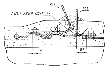 Перемычка электрическая Черт. 7 Примечания: 1. Места приварки закладных изделий и сами изделия после присоединения электрической перемычки покрыть эмалью типа ЭП или другими аналогичными химически стойкими защитными покрытиями. 2. Электроды - типа Э-42 по ГОСТ 9467-75. (Измененная редакция, Изм. № 1). Таблица 9 Ведомость расхода стали на одну трубу кг