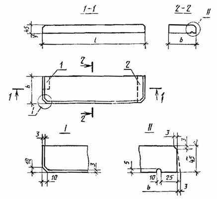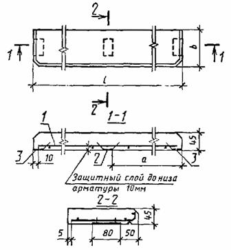 1 - вырез; 2 - срез торца; 3 - технологический уклон не более 3 мм. Во второй группе для плит, изготовляемых из плотного силикатного бетона, указывают вид бетона, обозначаемый прописной буквой «С». В третьей группе (или во второй группе марки плит, изготовляемых из тяжелого бетона) указывают: наличие в плите закладных изделий, обозначаемых арабскими цифрами: 1 - для плит с закладными изделиями, расположенными в середине длины плиты; 2 - для плит с закладными изделиями, расположенными по торцам и в середине длины плиты; наличие в плите вырезов в углах или срезов торцов, обозначаемых строчными буквами; левый вариант исполнения плиты, обозначаемый строчной буквой «л»; дополнительные характеристики плит, применяемых в условиях воздействия агрессивных сред, - проницаемость бетона, обозначаемую прописными буквами: «Н» - нормальная, «П» - пониженная и «О» - особо низкая проницаемость. Пример условного обозначения (марки) плиты типа ПОШ, длиной 1300 мм, шириной 150 мм, из тяжелого бетона: ПОШ13.15 То же, плиты типа ПОГ, длиной 1600 мм, шириной 250 мм, из тяжелого бетона, с закладным изделием в середине длины плиты ПОГ16.25-1 То же, плиты типа ПОО, длиной 2200 мм, шириной 350 мм, в правом варианте исполнения, из плотного силикатного бетона, с закладными изделиями по торцам и в середине длины плиты: ПОО22.35-С-2