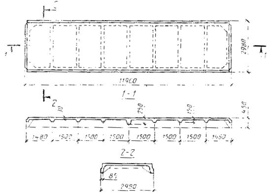 1.3.12. Требования к качеству поверхностей и внешнему виду плит - по ГОСТ 13015.0. При этом качество бетонных поверхностей плит должно удовлетворять требованиям, установленным для категории не ниже А6. 1.3.13. Концы напрягаемой арматуры не должны выступать за торцевые поверхности плит более чем на 10 мм и должны быть защищены слоем цементно-песчаного раствора или битумным лаком. 1.3.14. В бетоне плит, поставляемых потребителю, трещины не допускаются, за исключением: усадочных и других поверхностных технологических трещин, ширина которых не должна превышать в предварительно напряженных плитах 0,05 мм, в плитах с ненапрягаемой арматурой 0,1 мм; поперечных трещин в верхней зоне продольных ребер от обжатия бетона, а также в торцевых ребрах, ширина которых не должна превышать 0,15 мм. 1.4. Маркировка 1.4.1. Маркировка плит - по ГОСТ 13015.2. Маркировочные надписи и знаки следует наносить на наружные грани торцевого или продольного ребра плиты, а для плит серии ПК-01-88-на лицевую поверхность. 2. ПРИЕМКА2.1. Приемка плит - по ГОСТ 13015.1 и настоящему стандарту. При этом плиты принимают: по результатам периодических испытаний - по показателям прочности, жесткости и трещиностойкости плит, морозостойкости бетона, пористости уплотненной смеси легкого бетона, а также по водонепроницаемости бетона плит, предназначенных для эксплуатации в условиях воздействия агрессивной газообразной среды; по результатам приемо-сдаточных испытаний - по показателям прочности бетона (классу или марке бетона по прочности на сжатие, передаточной и отпускной прочности), средней плотности легкого бетона, соответствия арматурных и закладных изделий рабочим чертежам, прочности сварных соединений, точности геометрических параметров, толщины защитного слоя бетона до арматуры, ширины раскрытия технологических трещин, категории бетонной поверхности. 2.2. Периодические испытания нагружением предварительно напряженных плит для контроля их прочности, жесткости и трещиностойкости проводят перед началом массового изготовления плит и в дальнейшем - при внесении в них конструктивных изменений и при изменении технологии изготовления в соответствии с требованиями ГОСТ 13015.1. В процессе серийного производства плит испытания нагружением проводят не реже одного раза в год. Испытания плит длиной 5970 мм и менее в процессе их серийного производства могут не проводиться, если осуществляется неразрушающий контроль в соответствии с ГОСТ 13015.1. 2.3. Испытания бетона по показателю пористости (объему межзерновых пустот) уплотненной смеси легкого бетона следует проводить не реже одного раза в месяц. 2.4. Плиты по показателям точности геометрических параметров, толщины защитного слоя бетона до арматуры, категории бетонной поверхности и ширины раскрытия технологических трещин следует принимать по результатам выборочного контроля. 2.5. В документе о качестве плит, предназначенных для эксплуатации в условиях воздействия агрессивных газообразных сред, дополнительно должна быть приведена марка бетона по водонепроницаемости (если этот показатель оговорен в заказе на изготовление плит). 3. МЕТОДЫ КОНТРОЛЯ3.1. Прочность бетона плит следует определять по ГОСТ 10180 на серии образцов, изготовленных из бетонной смеси рабочего состава и хранившихся в условиях, установленных ГОСТ 18105. При контроле прочности бетона нера