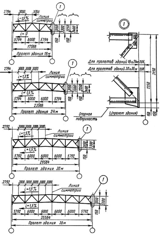 Постановлением Государственного комитета Совета Министров СССР по делам строительства от 28 апреля 1978 г. № 73 срок введения установлен с 01.01.79 Настоящий стандарт распространяется на стальные сварные стропильные фермы с элементами из парных уголков, соединенных в тавр, с уклоном верхнего пояса 1,5 %, предназначенные для производственных зданий пролетами 18, 24, 30 и 36 м: с рулонной и мастичной кровлей; со стальными и железобетонными колоннами; с неагрессивными и слабоагрессивными средами; возводимых в районах с расчетной температурой наружного воздуха минус 65 °С и выше и сейсмичностью до 9 баллов включительно. Стропильные стальные фермы должны удовлетворять требованиям ГОСТ 23118-78 и требованиям, изложенным в соответствующих разделах настоящего стандарта. 1. ОСНОВНЫЕ РАЗМЕРЫ1.1. Фермы должны изготовляться высотой: 3150 мм - для пролетов зданий 18, 24, 30 и 36 м; 2250 мм - для пролетов зданий 18 и 24 м. Фермы высотой 3150 мм для пролетов зданий 18 и 24 м должны применяться в зданиях, в которых наряду с пролетами 18 и 24 м имеются пролеты 30 и 36 м, а также в зданиях, где по условиям технологии производства требуется повышенная высота межферменного пространства. В остальных случаях выбор ферм по высоте для пролетов зданий 18 и 24 м производится на основе результатов сопоставления технико-экономических показателей рассмотренных вариантов. 1.2. Схемы и основные размеры ферм должны соответствовать указанным на черт. 1. Допускается применение дополнительных элементов решетки (шпренгелей, элементов для крепления путей подвесного транспорта, стоек для уменьшения расчетной длины основных стержней ферм и т.п.). 1.3. Членение ферм на отправочные элементы должно соответствовать черт. 2. СХЕМЫ И ОСНОВНЫЕ РАЗМЕРЫ ФЕРМ Черт. 1 ЧЛЕНЕНИЕ ФЕРМ НА ОТПРАВОЧНЫЕ ЭЛЕМЕНТЫ Фермы для пролетов зданий 18 м а) отправляются одним элементом допускается