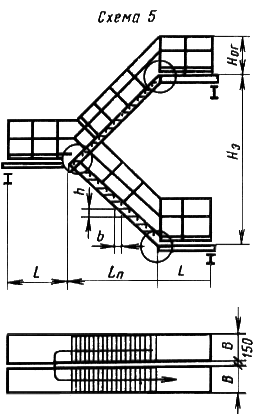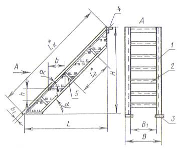 Постановлением Государственного комитета Совета Министров СССР по делам строительства от 28 апреля 1978 г. № 71 срок действия установлен с 01.01.1979 г. до 01.01.1984 г. Настоящий стандарт распространяется на стальные маршевые лестницы, площадки и ограждения к ним, применяемые в производственных зданиях и сооружениях, возводимых и эксплуатируемых в районах с расчетной температурой минус 65 °С и выше. Стандарт устанавливает технические требования на маршевые лестницы с углом наклона 45 и 60°, прямоугольные переходные площадки и ограждения к ним, изготовленные из холодногнутых и горячекатаных профилей и рассчитанные на действие нормативных временных нагрузок 200, 300 и 400 кгс/м2. Маршевые лестницы, площадки и ограждения к ним должны удовлетворять всем требованиям ГОСТ 23118-78 и требованиям, изложенным в соответствующих разделах настоящего стандарта. 1. Основные параметры и размеры1.1. Основные параметры и размеры лестничных маршей, прямоугольных площадок и ограждений к ним должны соответствовать указанным на черт. 1 - 4 и в табл. 1 - 4. Лестничный марш ____________ * По чертежам КМД. 1 - косоур; 2 - ступень; 3 - опорная планка; 4 - опорный уголок; 5 - ребро Черт. 1 Таблица 1 Размеры в мм