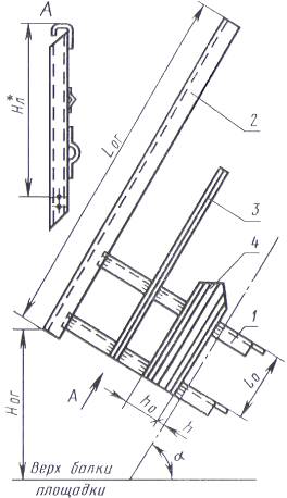 Ограждение лестничного марша ____________ * По чертежам КМД. 1 - стойка; 2 - поручень, 3 - средний ограждающий элемент; 4 - бортовой элемент Черт. 3 Таблица 3 Размеры в мм