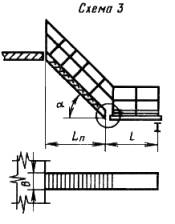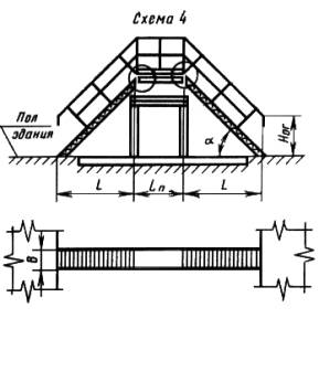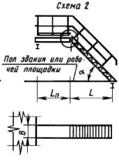 Пример условного обозначения марки лестничного марша (МЛ) из холодногнутого профиля (Х) со штампованными ступенями (Ш), под углом 45° и размерами Н = 6 дм и В = 8 дм: МЛХШ45-6.8 ГОСТ 23120-78 То же, площадки (ПМ) из холодногнутого профиля с рифленым настилом (Ф) и размерами Ln = 9 дм и В = 6 дм: ПМХФ-9.6 ГОСТ 23120-78 То же, левого ограждения (ОГл) лестничного марша из холодногнутого профиля без бортового элемента, под углом 45° и размерами Hor = 10 дм и H = 24 дм: ОГлМЛХ45-10.24 ГОСТ 23120-78 То же, правого ограждения (ОГп) с бортовым элементом (Эб): ОГпМЛХЭб45-10.24 ГОСТ 23120-78 То же, ограждений площадки из холодногнутого профиля с бортовым элементом и размерами Hor = 10 дм и Lor = 9 дм: ОГПМХЭб-10.9 ГОСТ 23120-78 1.2. В зависимости от условий эксплуатации ступени маршевых лестниц и настилы прямоугольных площадок должны изготовлять двух типов: 1 - сплошные из рифленой стали (Ф); 2 - решетчатые, исполнений: Ш - из штампованных элементов; Р - из полос на ребро и круглой стали; С - из полос на ребро в одном направлении; В - из просечно-вытяжной стали. 1.3. Типы ступеней маршевых лестниц и настилов в прямоугольных площадках приведены на черт. 5. 1.4. Компоновочные схемы маршевых лестниц, площадок и ограждений приведены в приложении. Типы ступеней маршевых лестниц и настилов площадок Тип 1. Сплошные (Ф)