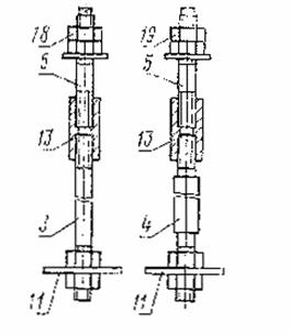 4. При установке составных болтов исполнений 1 и 2 нижняя шпилька совместно с муфтой и анкерной плитой устанавливается до бетонирования фундамента. Верхняя шпилька ввертывается в муфту и прихватывается сваркой после установки оборудования (пример 6), которое монтируется методом поворота или надвижки.
