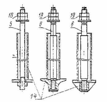 Болты с коническим концом закрепляются с помощью разжимной цанги (пример 12) или цементным раствором при вибропогружении в него шпильки болта (пример 13).