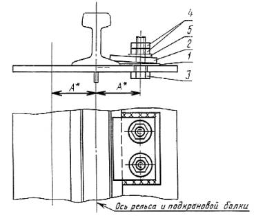 Постановлением Государственного комитета СССР по делам строительства от 4 мая 1981 г. № 60 срок введения установлен с 01.01.1982 г. Настоящий стандарт распространяется на узел крепления крановых рельсов по ГОСТ 4121-76 к стальным подкрановым балкам под мостовые электрические краны общего назначения легкого, среднего и тяжелого режимов работы, применяемые в зданиях и на открытых крановых эстакадах с расчетной сейсмичностью до 9 баллов включительно и эксплуатируемые в районах с расчетной температурой наружного воздуха минус 65 °С и выше. 1. Конструкция и размеры1.1. Конструкция узла крепления должна соответствовать указанной на черт. 1. 1 - упорная планка; 2 - прижимная планка; 3 - болт; 4 - гайка; 5 - шайба * Размер для справок 1.2. Марка узла крепления в зависимости от типа кранового рельса и расчетной температуры наружного воздуха района строительства (далее - расчетная температура), расстояние от оси подкрановой балки до оси узла крепления, а также обозначения деталей должны соответствовать указанным в табл. 1. 1.3. Конструкция и размеры упорных планок должны соответствовать указанным на черт. 2 и в табл. 2. * Размер для справок Таблица 1