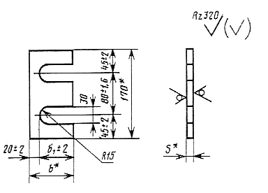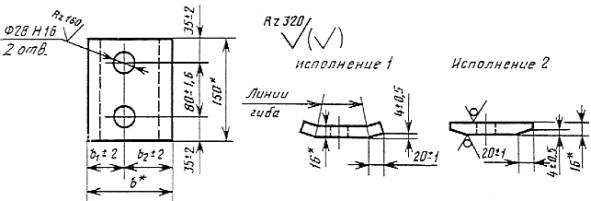Пример условного обозначения прижимной планки П1 исполнения 1 для расчетной температуры минус 40 °С и выше: Планка П1 ГОСТ 24741-81 То же, исполнения 2 для расчетной температуры ниже минус 40 до минус 65 °С: Планка П1ХЛ - 2 ГОСТ 24741-81 Пример условного обозначения узла для крепления марки 70 с прижимной планкой исполнения 1 для расчетной температуры минус 40 °С и выше: Крепление 70 ГОСТ 24741-81 То же, исполнения 2 для расчетной температуры ниже минус 40 до минус 65 °С: Крепление 70ХЛ - 2 ГОСТ 24741-81 2. Технические требования2.1. Упорные и прижимные планки должны изготовляться в соответствии с требованиями настоящего стандарта и СНиП III-18-75 по рабочим чертежам КМД, утвержденным в установленном порядке. 2.2. Материал прижимных и упорных планок - сталь по ГОСТ 380-71 следующих марок: ВСт3кп2 - для расчетной температуры минус 40 °С и выше; ВСт3Гпс5 или ВСт3сп5 - для расчетной температуры ниже минус 40 до минус 65 °С включ. Разрешается применять стали по ГОСТ 23570-79 следующих марок: 18кп вместо ВСт3кп2; 18Гпс или 18сп вместо ВСт3Гпс5 и Вст3сп5. 2.3. Болты, предназначенные для эксплуатации при расчетной температуре минус 40 °С и выше, должны быть испытаны на разрыв по ГОСТ 1759-70, при расчетной температуре ниже минус 40 до минус 65 °С - дополнительно испытаны на разрыв на косой шайбе и ударную вязкость по ГОСТ 1759-70. 2.4. Предельные отклонения линейных размеров от номинальных, а также шероховатость поверхностей планок должны соответствовать указанным на черт. 2 и 3. 2.5. Предельные отклонения диаметров отверстий прижимных планок от номинальных - по ГОСТ 25347-82. 3. Комплектность3.1. Детали узлов крепления крановых рельсов должны поставляться предприятием-изготовителем комплектно. В состав комплекта должны входить: детали в соответствии с табл. 4; техническая документация в соответствии с требованиями ГОСТ 23118-78. Таблица 4