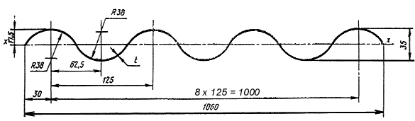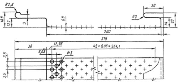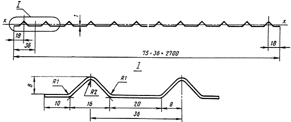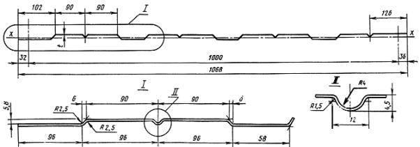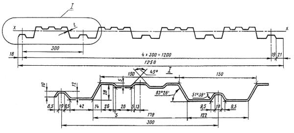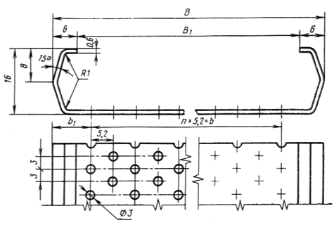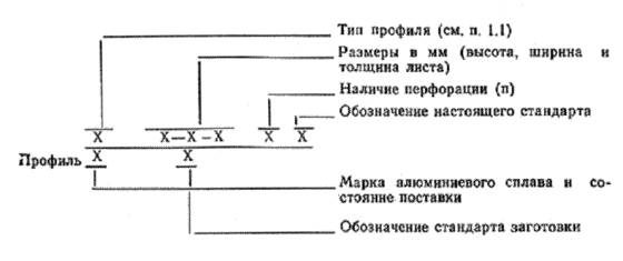 Постановлением Государственного комитета СССР по делам строительства от 7 мая 1981 года № 64 срок введения установлен с 01.01.82 Настоящий стандарт распространяется на холодногнутые профили из алюминия и алюминиевых сплавов, изготовляемые на профилегибочных станах и предназначенные для ограждающих строительных конструкций. 1. Сортамент1.1. По назначению профили подразделяются на типы: А - для стен, перегородок и покрытий; ПА - для обшивок трехслойных панелей; СА - для подвесных потолков, нащельников, солнцезащитных устройств и других конструкций специального назначения. 1.2. Условное обозначение профилей принимается в соответствии со схемой. Пример условного обозначения алюминиевого профиля типа СА высотой 20 мм, шириной 300 мм, толщиной листа 0,8 мм, имеющего перфорацию (п), из алюминиевой ленты сплава марки АМц, отожженной (М) по ГОСТ 13726-78: Профиль СА 20-300-0,8п ГОСТ 24767-81 АМцМ ГОСТ 13726-78 1.3. Форма сечений, размеры, площади сечений, масса 1 м длины и 1 м2, а также справочные величины профилей должны соответствовать указанным на черт. 1 - 14 и в табл. 1 - 14. (Измененная редакция, Изм. № 1). 1.4. Профили должны изготовляться: мерной длины от 1,2 м до 7,8 м - для профилей типа А; кратной (300 мм) мерной длины от 1,2 м до 7,8 м - для профилей типов ПА и СА. Длина профилей не должна превышать размеров, указанных в табл. 1 - 14. По соглашению сторон допускается поставка профилей немерной длины (не менее 1,0 м) в количестве не более 2 % от массы поставляемой продукции. Профили типа А высотой 6 мм Таблица 1