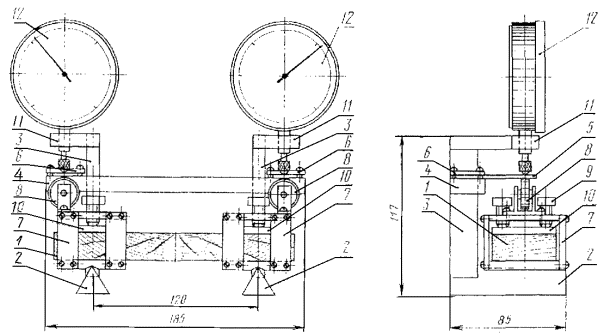 ПРИЛОЖЕНИЕ 1Обязательное 1. ОПИСАНИЕ ПРИБОРА1.1. Принцип работы прибора (см. черт. 1 настоящего стандарта) состоит в том, что усилие коробления односторонне увлажняемого образца воспринимается и частично уравновешивается упругими элементами определенной жесткости, по деформациям которых определяют величину стесненного коробления испытываемого образца. 1.2. Базой измерения прибора является вылет консоли упругого элемента, который должен быть равен 30±0,5 мм. 1.3. Прибор состоит из следующих деталей: двух призматических опор 2 с закрепленными на них стойками 3; ригеля 4, укрепленного на стойках 3; двух упругих элементов 5 размерами 1´15´60 мм, изготавливаемых из стали 65Г по ГОСТ 1050-70, закрепляемых на ригеле 4 прижимными планками 6; двух жестких обойм коробчатого сечения 7, имеющих на верхней грани выполненные из шарикоподшипников ролики 8, прижимные винты 9 и распределительные накладки 10 для закрепления образца 1. Поверхности оснований обойм 7 и накладок 10, соприкасающиеся с образцом 1, должны иметь рифление; двух кронштейнов 11, укрепленных на стойках 3, для установки индикаторов 12. 1.4. Все детали прибора должны иметь защиту от действия влаги. 2. ПОДГОТОВКА ПРИБОРА К РАБОТЕ 2.1. Отпускают винты крепления ригеля к стойкам для свободного перемещения его в вертикальной плоскости. 2.2. Закрепляют шаблон в виде правильного параллелепипеда в обоймах прибора. 2.3. Обоймы с закрепленным шаблоном устанавливают на призматические опоры прибора. 2.4. Ригель с укрепленными на нем упругими элементами устанавливают так, чтобы ролики обойм касались нижних поверхностей упругих элементов. 2.5. После закрепления ригеля на стойках ролики обойм должны свободно проворачиваться на осях, не теряя контакта с упругими элементами. 2.6. На кронштейнах стоек устанавливают и закрепляют индикаторы часового типа. ПРИЛОЖЕНИЕ 2Обязательное ЖУРНАЛ ИСПЫТАНИЙ ЗАЩИТНЫХ ПОКРЫТИЙ И ПРОПИТОК НА ВЛАГОПРОНИЦАЕМОСТЬ