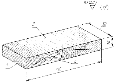 Постановлением Государственного комитета Совета Министров СССР по делам строительства от 11 марта 1977 г. № 12 срок введения установлен с 01.01 1978 г. Несоблюдение стандарта преследуется по закону Настоящий стандарт распространяется на строительные детали, изделия и конструкции из древесины (в том числе клееные) и устанавливает метод определения условной влагопроницаемости (в дальнейшем - влагопроницаемость) влагозащитных покрытий и пропиток. Стандарт не распространяется на детали, изделия и конструкции из древесноволокнистых, древесностружечных плит и фанеры и композиций из этих материалов, в том числе с древесиной. Сущность метода заключается в определении величины отношения максимальных деформаций стесненного коробления защищенного покрытием или пропиткой и незащищенного (контрольного) образцов, при их одностороннем увлажнении. Под стесненным короблением понимается изменение формы образца, ограниченное воздействием внешних сил. 1. АППАРАТУРА И МАТЕРИАЛЫПрибор конструкции ЦНИИСК для измерения деформаций стесненного коробления (черт. 1). Описание принципа работы и конструкции прибора представлено в обязательном приложении 1. Индикатор часового типа - по ГОСТ 577-68 с ценой деления 0,01 мм. Штангенциркуль - по ГОСТ 166-73 с точностью измерения до 0,1 мм. Ванна для воды размерами 50´120´220 мм. 1 - образец; 2 - призматические опоры; 3 - стойки; 4 - ригель; 5 - упругие элементы; 6 - прижимные планки; 7 - обоймы-зажимы; 8 - ролики; 9 - прижимные винты; 10 - распределительные накладки; 11 - кронштейны; 12 - индикаторы Черт. 1 Питьевая вода - по ГОСТ 2874-73. Эпоксидная шпатлевка ЭП-0010 - по ГОСТ 10277-76 или перхлорвиниловый лак ХВ-784 по ГОСТ 7313-75. Аппаратура и материалы - по ГОСТ 16483.7-71. 2. ПОДГОТОВКА К ИСПЫТАНИЮ2.1. Оценку влагопроницаемости проводят на образцах ядровой древесины сосны или ели. 2.2. Влажность древесины образца должна быть 8±2%. Влажность определяют по ГОСТ 16483.7-71. 2.3. Древесина образца не должна иметь пороков по ГОСТ 2140-71. 2.4. Форма, размеры и направление волокон образца должны соответствовать указанным на черт. 2. Отклонения от указанных размеров не должны превышать ±0,5 мм. Стрела прогиба внутренней пласти от коробления образца не должна быть более 0,5 мм. На торцевой грани образца годовые кольца должны быть симметричны относительно центральной поперечной оси. 2.5. Шероховатость поверхности образца должна соответствовать указанной на черт. 2. 1 - наружная пласть образца; 2 - внутренняя пласть образца; 3 - центральная поперечная ось Черт. 2 2.6. Образцы выпиливают последовательно один за другим из заготовки с тангентальным расположением годовых слоев. Соседние по направлению волокон древесины образцы считают парными и соответственно маркируют. 2.7. Для испытаний подготавливают пять пар образцов. Один образец от каждой пары является основным, другой - контрольным. 2.8. Торцы и кромки основных и контрольных образцов покрывают эпоксидной шпатлевкой или перхлорвиниловым лаком. 2.9. Шпатлевку наносят в два слоя. Для первого слоя шпатлевку разбавляют растворителем № 646 по ГОСТ 18188-72 до вязкости 50±5 с по вискозиметру ВЗ-4 (ГОСТ 8420-74). При нанесении второго слоя используют неразбавленную шпатлевку. Общая толщина покрытия должна быть 440±10 мкм. Толщину покрытия проверяют по ГОСТ 14644-75. 2.10. Лак вязкостью от 20 до 50 с по вискозиметру ВЗ-4 наносят в несколько слоев. Общая толщина покрытия дол