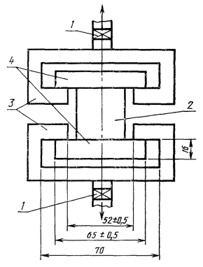1 - карданный шарнир; 2 - образец; 3 - захваты, 4 - колодки. Черт. 1. Допускается применение других видов захватов, обеспечивающих направление нагрузки перпендикулярно к плоскости образца. Колодки из древесины твердых пород влажностью не более 12 %, металла, лигнофоля или цементостружечной плиты с плотностью не менее 1200 кг/м3. Размеры колодок: длина (65,0 ± 0,5) мм, ширина (50 ± 0,5) мм и высота не менее 16 мм. Волокна древесины должны быть параллельны длинной стороне колодок. Колодки наклеивают на пласти образца. Прочность приклейки колодок к поверхности образца должна обеспечивать разрушение по цементостружечной плите (образцу). 4.1.4. Приспособление для определения глубины дефектов на поверхности плит, состоящее из индикатора часового типа марки ИЧ-10 по ГОСТ 577-68, закрепленного на металлической скобе с двумя плоскими опорными поверхностями. Установку шкалы индикатора в нулевое положение, соответствующее плоскости опорных поверхностей скобы, осуществляют при помощи поверочной линейки по ГОСТ 8026-75, поверочной плиты по ГОСТ 10905-86 или стеклянной пластинки по ТУ 3-3.2122-88. Ход штока индикатора в обе стороны от опорной плоскости должен быть не менее 3 мм. 4.1.5. Весы по ГОСТ 24104-88 с погрешностью взвешивания не более 0,1 г. 4.1.6. Приборы для измерения толщины образцов с ценой деления 0,01 мм: микрометр по ГОСТ 6507-90 или индикаторный толщиномер по ГОСТ 11358-89. 4.1.7. Штангенциркуль по ГОСТ 166-89 с ценой деления не более 0,1 мм, набор щупов № 4 по ТУ 2-034-225-87. 4.1.8. Измерительная металлическая линейка по ГОСТ 427-75 с ценой деления 1 мм, поверочная линейка по ГОСТ 8026-75 длиной 1000 мм. 4.1.9. Измерительная металлическая рулетка по ГОСТ 7502-89 с ценой деления 1 мм. 4.1.10. Сушильный шкаф, обеспечивающий поддержание температуры (103±2) °С. 4.1.11. Эксикатор по ГОСТ 25336-82. 4.1.12. Гигроскопическое вещество: хлористый кальций по ТУ 6-09-4711-81 или серная кислота по ГОСТ 4204-77 концентрацией не менее 94 %. Периодичность смены гигроскопического вещества не реже одного раза в неделю. 4.1.13. Сосуд для воды с термостатом, обеспечивающим постоянную температуру (20 ± 1) °С, и с устройством в виде решетки из проволоки, позволяющим удерживать под водой в вертикальном положении образцы для определения водопоглощения и разбухания по толщине. 4.1.14. Питьевая вода по ГОСТ 2874-82. 4.1.15. Фильтровальная бумага по ГОСТ 12026-76. 4.2. Отбор образцов и подготовка к испытаниям. 4.2.1. Для испытаний физико-механических свойств из каждой отобранной плиты вырезают образцы, размеры и число которых соответствуют указанным в табл. 4. Таблица 4
