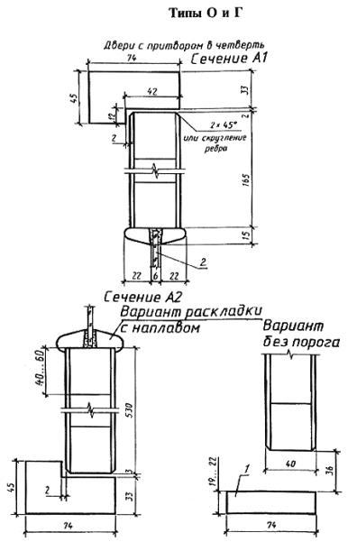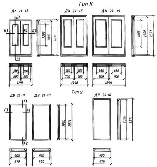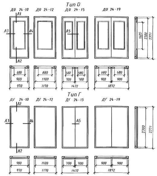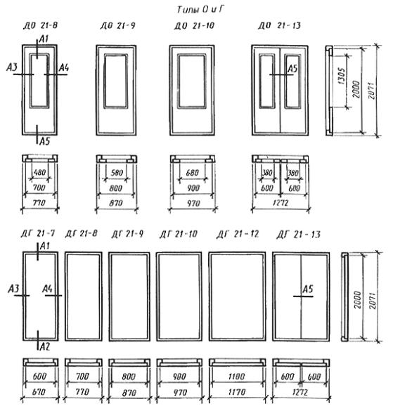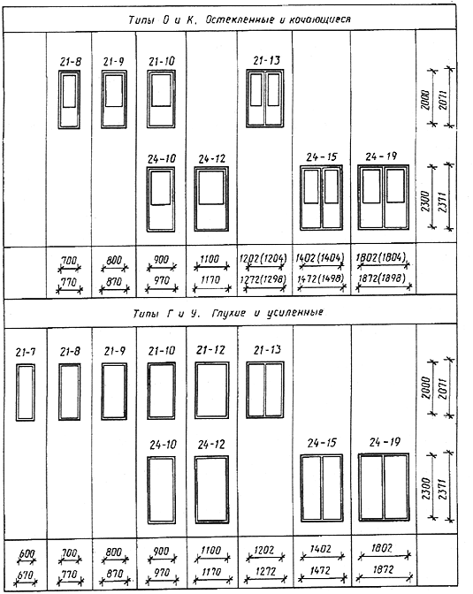 Дата введения 01.01.89 Настоящий стандарт распространяется на деревянные внутренние двери для жилых и общественных зданий, а также для административных и вспомогательных зданий и помещений предприятий различных отраслей народного хозяйства. Стандарт не распространяется на двери специального назначения (в т.ч. противопожарные и звукоизоляционные) и двери из древесины ценных пород. 1. ТИПЫ1.1. Двери в зависимости от конструкции подразделяют на следующие типы: Г - с глухими полотнами; О - с остекленными полотнами; К - с остекленными качающимися полотнами; У - со сплошным заполнителем полотен, усиленные для входов в квартиры. 1.2. Двери типов Г и О изготовляют с одно- и двупольными полотнами, с мелкопустотным (решетчатым) заполнением полотен, с порогом и без порога, с наплавом и без наплава, с обкладками и без обкладок, с коробками и без коробок. Двери типа К изготовляют с двупольными полотнами, с мелкопустотным заполнением полотен, без порога, без наплава, с обкладками и без обкладок, с коробками. Двери типа У изготовляют с однопольными глухими полотнами, с порогом, без наплава, без обкладок, с усиленными коробками или без коробок. 1.3. Двери, изготовляемые по настоящему стандарту, относят к дверям нормальной влагостойкости. 1.4. Габаритные размеры дверей должны соответствовать указанным на черт. 1. Размеры на чертежах стандарта даны для неокрашенных изделий и деталей в миллиметрах. Размеры проемов для дверей приведены в приложении 1. По требованию потребителя допускается изготовление дверей типов О и К размерами 24-12, 24-15, 24-19, а также дверей типа Г размерами 24-15, 24-19 высотой 2071 мм. Допускается изготовление двупольных дверей типов Г и О с неравными по ширине полотнами. 1.5. Устанавливается следующая структура условного обозначения (марки) дверей: