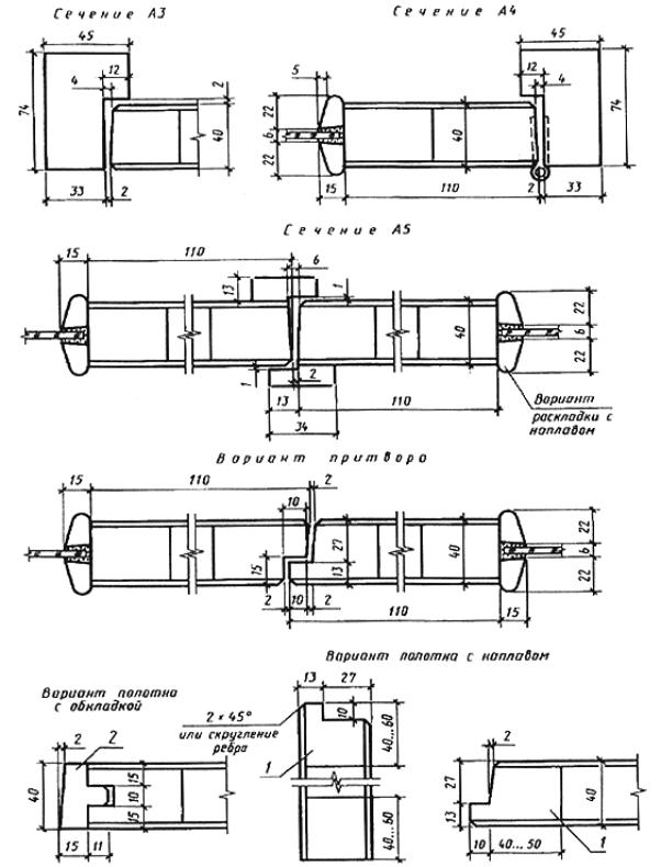 1 - петли ПН1-110, ПН1-85, ПН2-110, ПН2-85, ПН3-110, ПН4; 2 - ручки РС100, РС140, РК1, РК2, замки и защелки; 3 - задвижки ЗТ; 4 - петли ПВ1-100, ПВ2-125 или винтовые и накладные петли, изготовляемые по специальным ТУ; 5 - замки ЗВ7А, ЗВ4; 6 - петли ПН1-130, ПН1-150, ПН2-130, ПН3-130, ПН3-150.