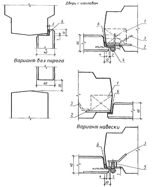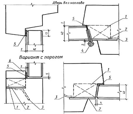 1 - деревянная пробка; 2 - стальная пластина; 3 - анкер; 4 - накладная петля; 5 - уплотняющая прокладка; 6 - деревянный порог