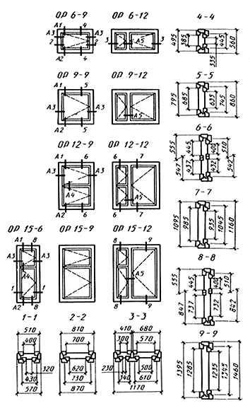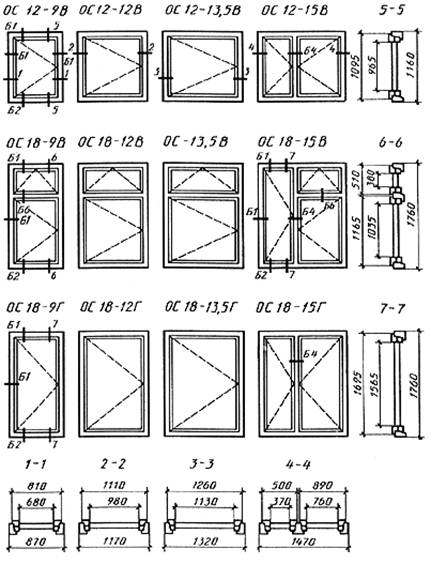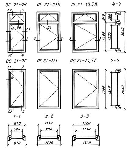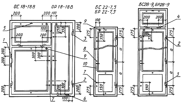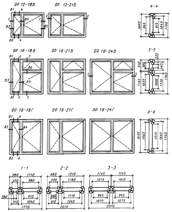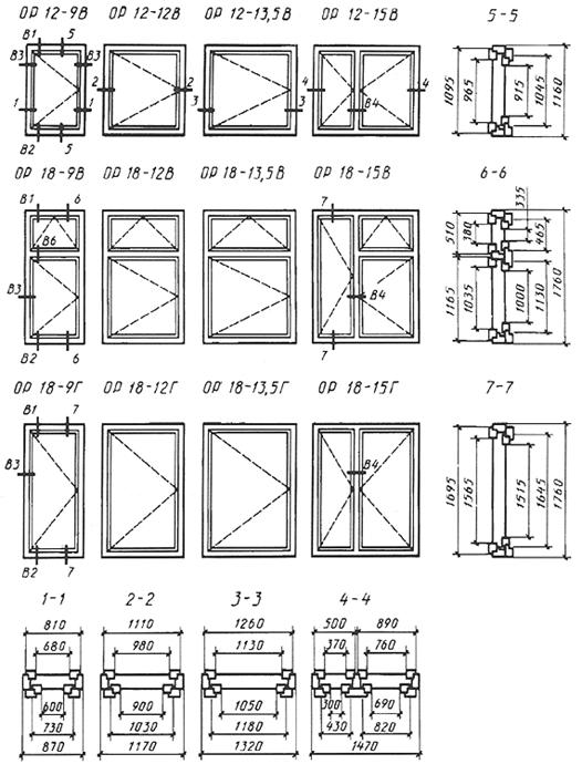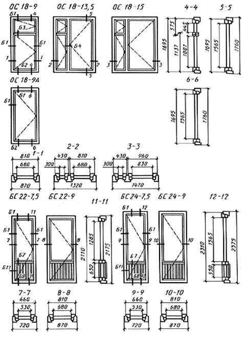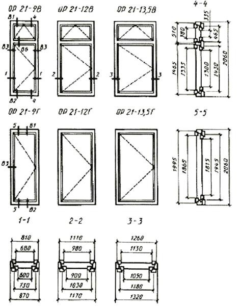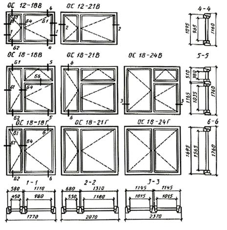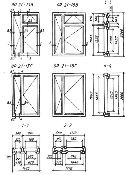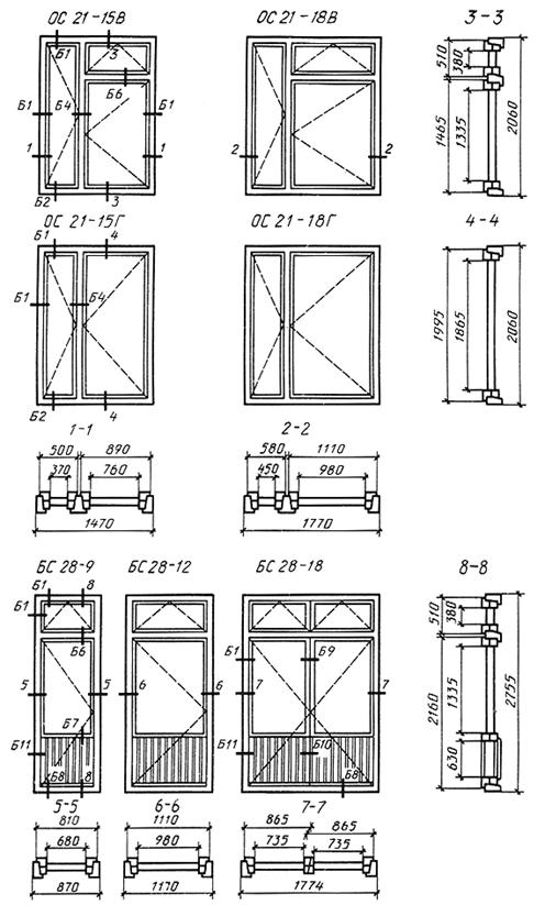 Черт. 5 Конструкция, форма, основные размеры и марки окон и балконных дверей общественных зданий