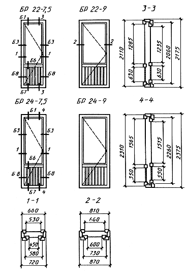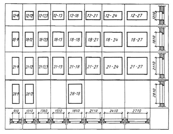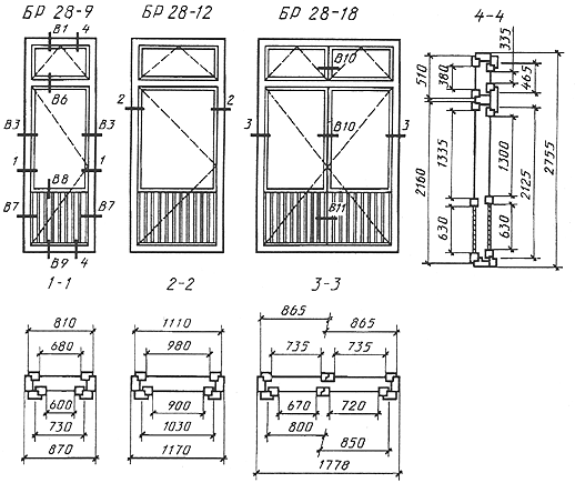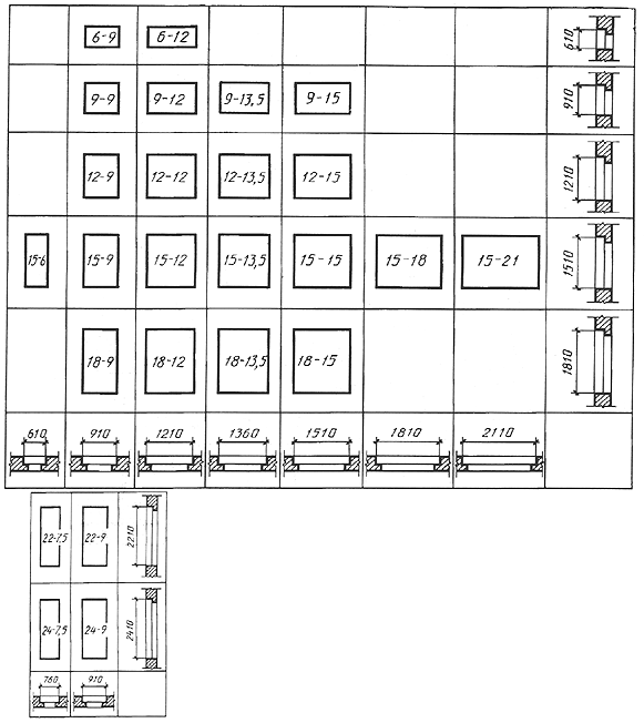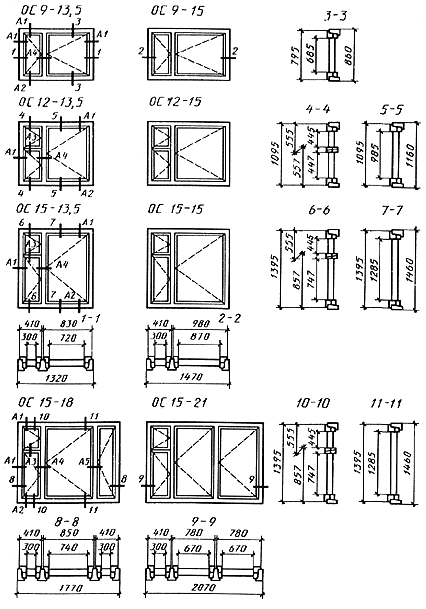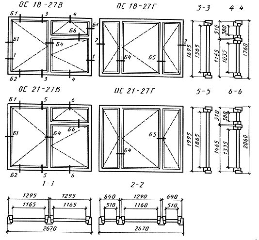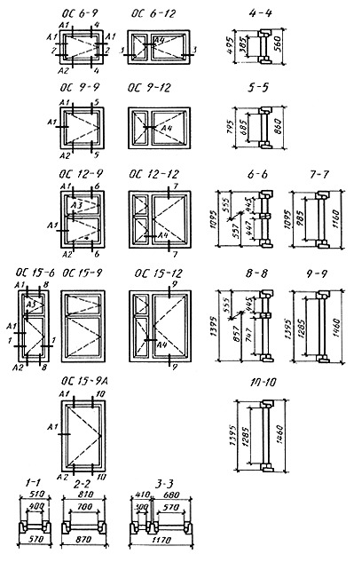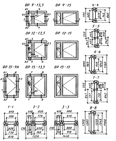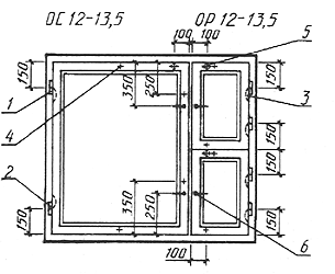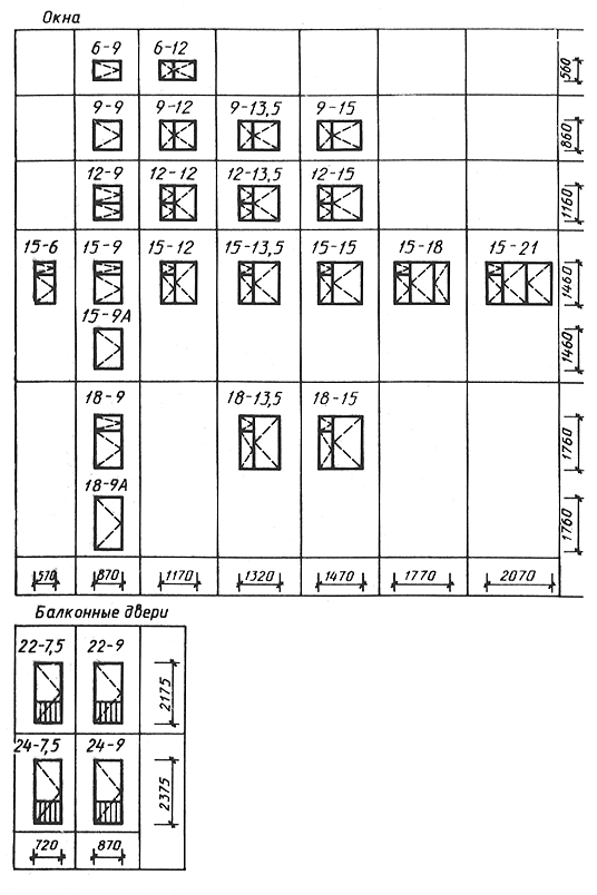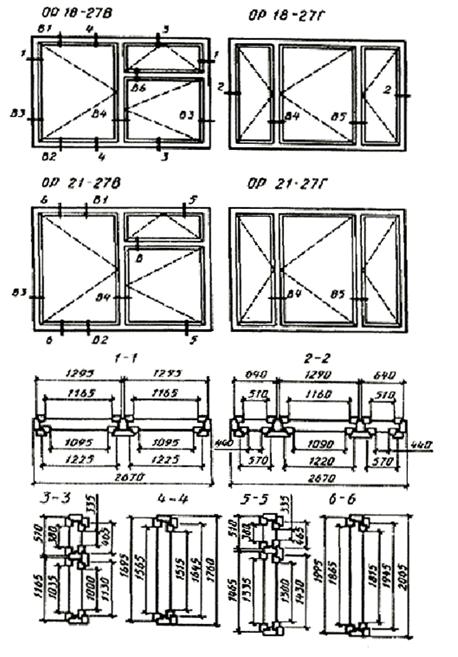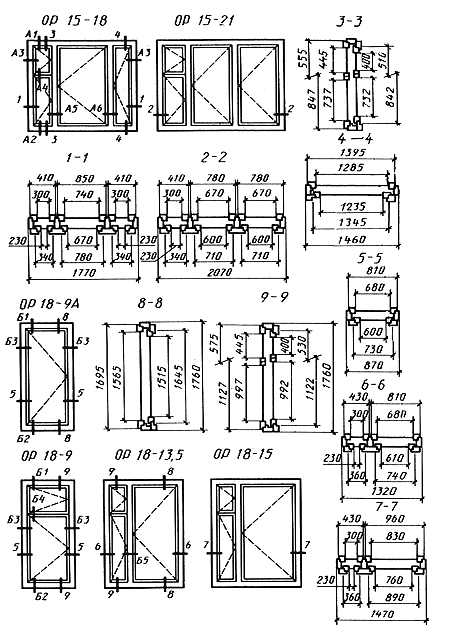 Черт. 5 Конструкция, форма, основные размеры и марки окон и балконных дверей общественных зданий