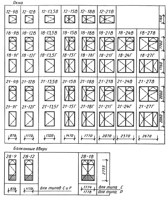 Черт. 1 Габаритные размеры окон и балконных дверей типов С и Р общественных зданий