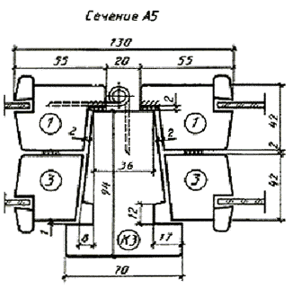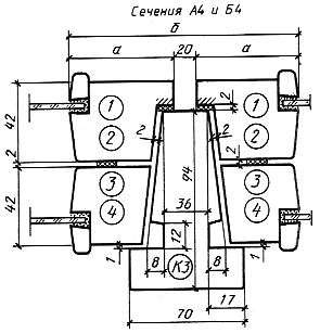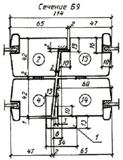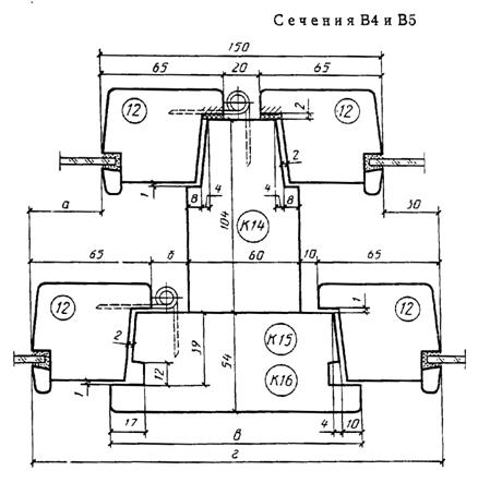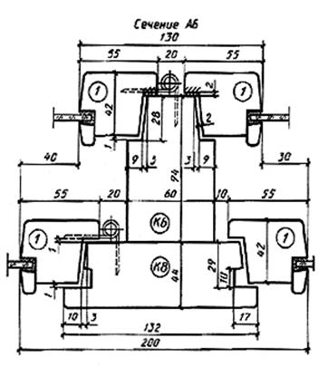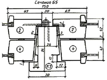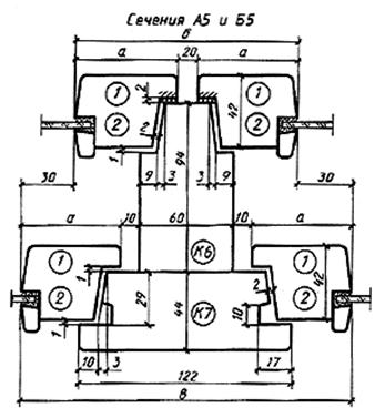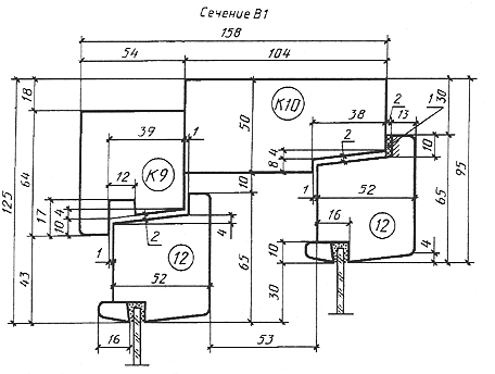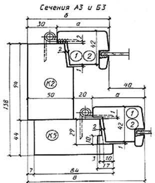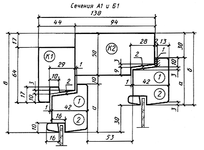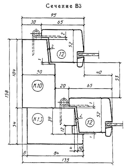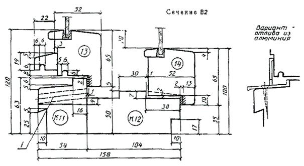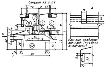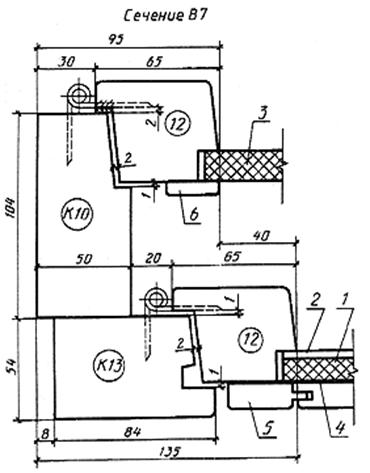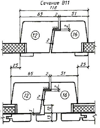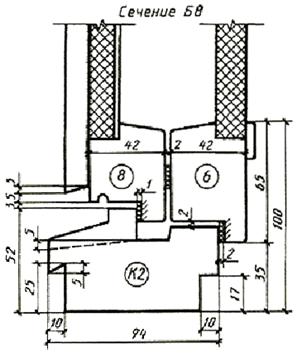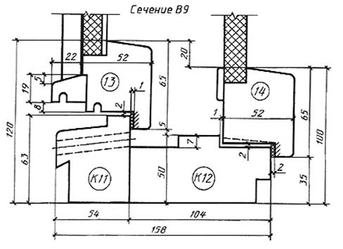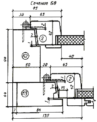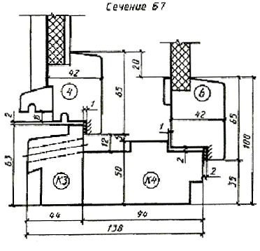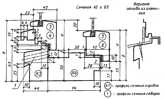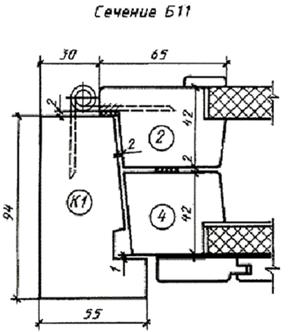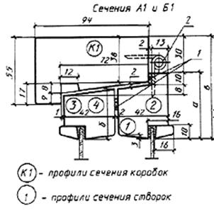 Примечания: 1.К1 – профили сечения коробок; 1 (в круге) – профили сечения створок. 2. Ширину верхнего выступа нижнего бруска коробки допускается уменьшать на 2 мм. 3. Толщину нижнего бруска коробки допускается увеличивать на 3 мм с соответствующим увеличением высоты коробки.