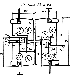 Примечания: 1. Допускается размеры штапика уменьшать до 14´9 мм. 2. Толщину брусков внутренней коробки (кроме нижних) допускается уменьшать на 5 мм с соответствующим изменением габаритов коробки. 3. Ширину канавки в брусках наружной коробки допускается уменьшать до 8 мм.