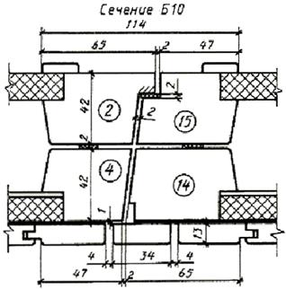 1 - мягкая древесноволокнистая плита толщиной 12 мм по ГОСТ 4598-86; 2 - твердая древесноволокнистая плита марки Т группы «А» толщиной 3,2-4 мм по ГОСТ 4598-86; 3 - шлифованная древесностружечная плита толщиной 16 мм по ГОСТ 10632-89; 4 - пергамин по ГОСТ 269783; 5 - обшивка типа О-2 по ГОСТ 8242; 6 - раскладка Черт. 50