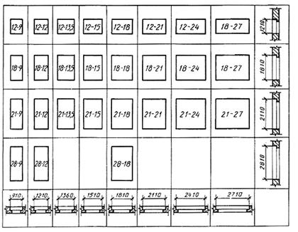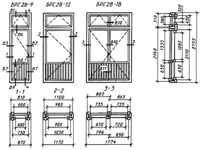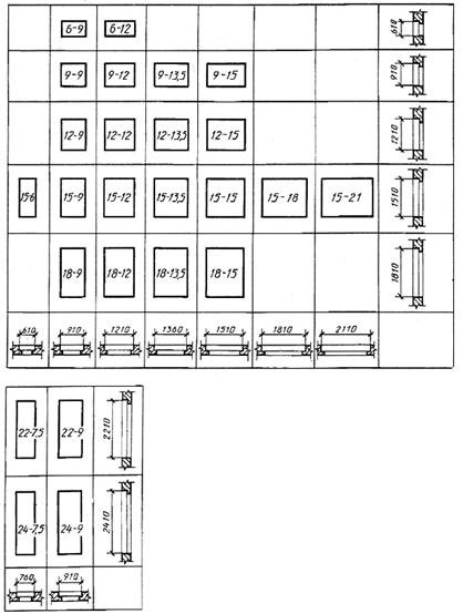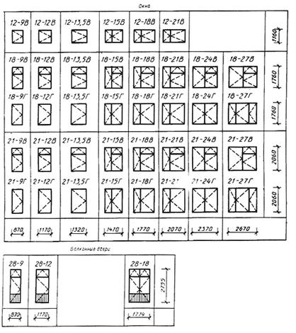 Черт. 1 Типы и габаритные размеры окон и балконных дверей общественных зданий