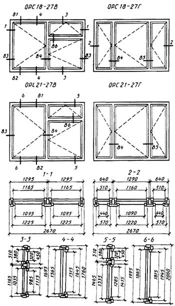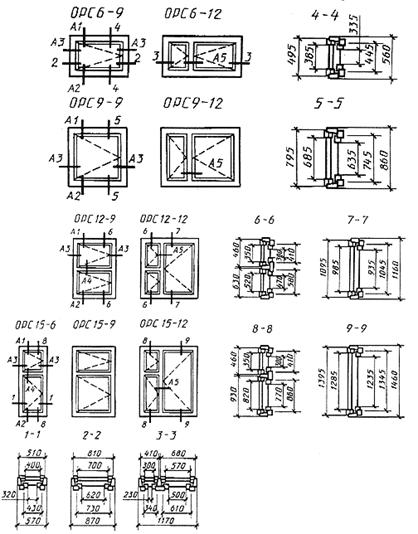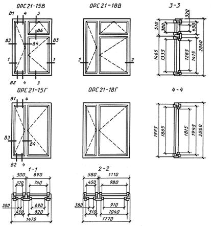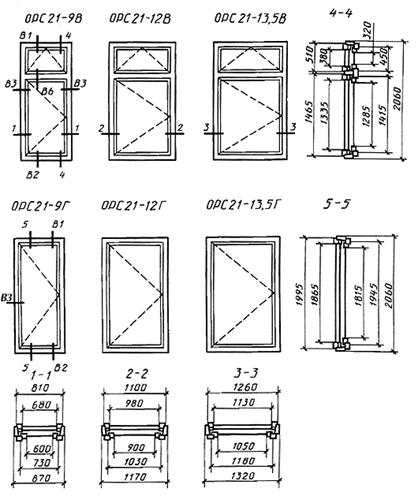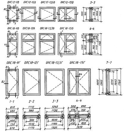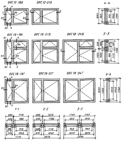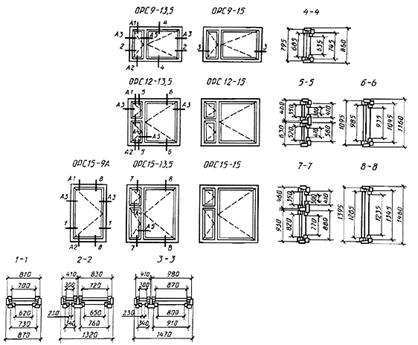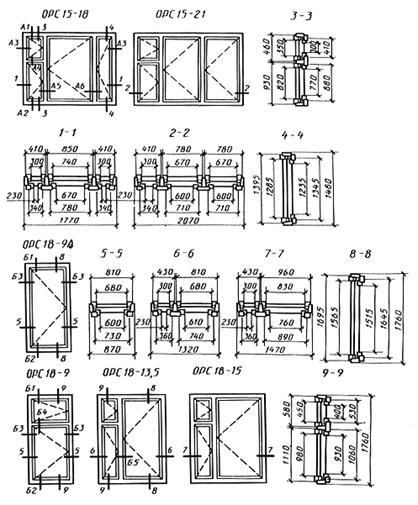 Черт. 15 Конструкция, форма, основные размеры и марки окон и балконных дверей общественных зданий