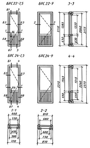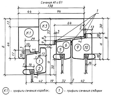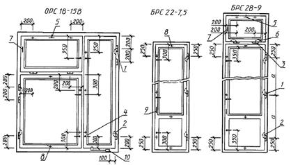 Примеры условных обозначений: Окно правое типа РС для проема высотой 15 и шириной 9 дм: ОРС15-9 ГОСТ 16289-86 То же, левое: ОРС15-9Л ГОСТ 16289-86 Окно типа РС для проема высотой 15 и шириной 13,5 дм, с форточной створкой: ОРС15-13,5 ГОСТ 16289-86 То же, для проема высотой 18 и шириной 18 дм, с несимметричным рисунком (вариант В): ОРС18-18В ГОСТ 16289-86 То же, в негативном изображении: ОРС18-18ВН ГОСТ 16289-86 Дверь балконная правая типа РС для проема высотой 22 и шириной 7,5 дм: БРС22-7,5 ГОСТ 16289-86 То же, левая: БРС22-7,5 Л ГОСТ 16289-86 2. ТРЕБОВАНИЯ К КОНСТРУКЦИИ2.1. Окна и балконные двери должны изготовляться в соответствии с требованиями ГОСТ 23166-78 и настоящего стандарта по рабочим чертежам, утвержденным в установленном порядке. 2.2. Конструкция, форма, основные размеры и марки окон и балконных дверей для жилых зданий должны соответствовать указанным на черт. 3-6, размеры сечений - на черт. 7-15; для общественных зданий на черт. 16-22, размеры сечений - на черт. 23-32. 2.3. Размеры на общих видах окон и балконных дверей даны в свету, по наружным сторонам створок, форточек, фрамуг и полотен дверей и по наружным сторонам коробок. На чертежах, приведенных в настоящем стандарте, указаны размеры для неокрашенных деталей и изделий в миллиметрах. 2.4. Для отвода дождевой воды в нижних брусках коробок и в горизонтальных импостах под широкими створками, фрамугами и полотнами сверлят отверстия диаметром 10 мм, располагаемые на расстоянии 50 мм от вертикальных брусков коробок и импостов, а под форточными и узкими створками - одно отверстие посередине створок. 2.5. Наружные створки окон и наружные полотна балконных дверей должны быть оснащены врезными завертками со съемными ручками, а фрамуги - фрамужными приборами по ГОСТ 5090-79. 2.6. Наружные створки окон и наружные полотна балконных дверей должны быть навешены на врезные петли с вынимающимися стержнями по ГОСТ 5088-76. Внутренние створки окон высотой более 1400 мм и шириной более 600 мм, высотой более 1000 мм и шириной более 900 мм, а также полотна балконных дверей должны быть навешены на три петли. 2.7. Для остекления окон и балконных дверей жилых зданий следует применять стекло по ГОСТ 111-78 толщиной 2,5-3 мм, а для общественных зданий - толщиной 3-4 мм. Толщину стекла уточняют в проекте с учетом ветровых нагрузок и шумовых воздействий в районе строительства и указывают в заказе на изделия. 2.8. Места расположения уплотняющих пенополиуретановых прокладок по ГОСТ 10174-72 в притворах окон и балконных дверей указаны на чертежах сечений. 2.9. По требованию потребителей по периметру коробок окон и балконных дверей на торцевых и боковых поверхностях допускаются продольные пазы различного профиля, заполняемые деревянными вкладышами и обрамляемые наличниками при соединении изделий друг с другом. 2.10. Для обеспечения возможности оборудования окон и балконных дверей общественных зданий фрамужными приборами рычажного типа допускается увеличивать толщину верхних и вертикальных брусков коробок и импостов на 20 мм без изменения габаритов изделий. 2.11. По согласованию изготовителя с потребителем допускается изготовление балконных дверей высотой 28 модулей с фрамугами в отдельных коробках. В этом случае высоту глухой части полотен или остекленной части фрамуг уменьшают на 50 мм. 2.12. Расположение приборов в окнах и балконных дверях (примеры) приведено в приложении 3; спецификация стекол для окон и 