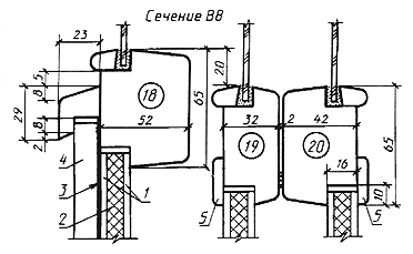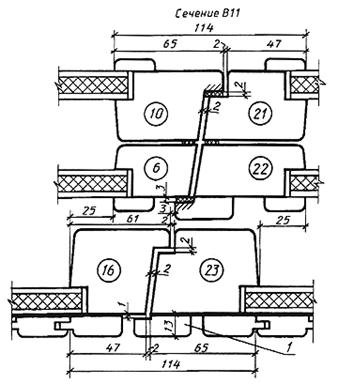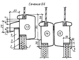 1 - твердая ДВП толщиной 3,2-4 мм по ГОСТ 4598; 2 - мягкая ДВП толщиной 8 мм по ГОСТ 4598; 3 - пергамин по ГОСТ 2697; 4 - обшивка типа О-2 по ГОСТ 8242; 5 - раскладка Черт. 13