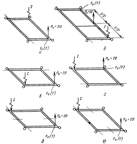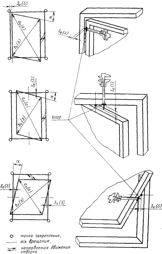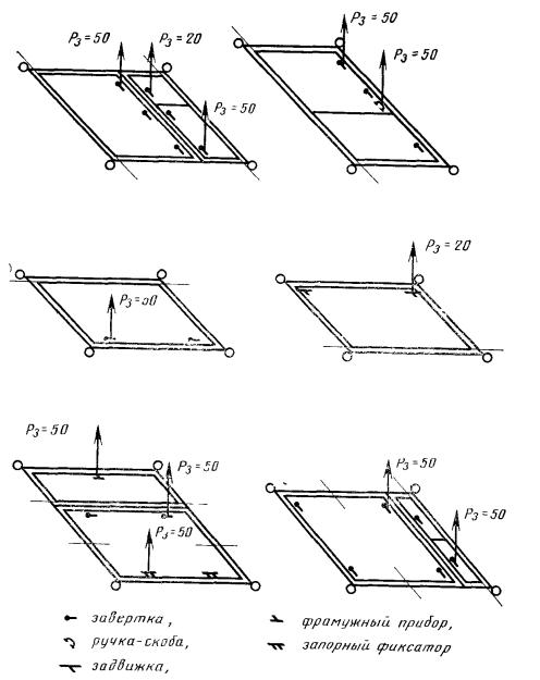 Измерение зазора s0 (s) Черт. 1. 2.1.4.3. Включают рабочий ход машины. Скорость движения свободной кромки створки должна быть от 0,1 до 0,5 м/с, в зависимости от ширины створки. 2.1.4.4. В каждом образце испытывают поочередно все створки. Спаренные створки испытывают в соединенном состоянии (наружная и внутренняя вместе). 2.1.4.5. При приемочных испытаниях каждую створку испытывают на начальную безотказность контрольной наработкой Т циклов, в зависимости от условий эксплуатации створок при открывании: постоянном - 1000; эпизодическом - 300. 2.1.4.6. По окончании испытания производят осмотр образца с целью обнаружения повреждений. Поворачивают створку в первоначальную позицию - на заданный угол a и измеряют диагонали а, b и зазор s. 2.1.4.7. В случае возникновения отказа наработку Т' определяют по счетчику циклов машины. 2.1.4.8. При доводочных и исследовательских испытаниях каждую створку испытывают, как указано в пп. 2.1.4.1 - 2.1.4.7, а затем, если это предусмотрено программой работ, определенное их количество, но не менее 3 створок подвергают дополнительному испытанию до первого отказа. Наработку Т' определяют по счетчику циклов машины. Допускаются дополнения испытания, не противоречащие сущности метода, предусмотренные программой работ. 2.1.5. Обработка, оценка и оформление результатов 2.1.5.1. Вычисляют изменения величин диагоналей Dа, Db и зазора Ds по формулам: Dа = а - a0; Db = b - b0; Ds = s - s0 Изменения диагоналей выражают в процентах от их первоначального размера. 2.1.5.2. После контрольной наработки образцы не должны иметь повреждений и изменений диагоналей Dа, Db; изменение зазора - Ds не должно превышать 0,5 мм на 1 м длины стороны створки. Наработка, вызвавшая отказ, для каждой створки должна быть T' > 3T. 2.1.5.3. Результаты испытания заносят в отчет. Отчет о доводочных и исследовательских испытаниях должен содержать также анализ результатов (в том числе статистических показателей исследовательских испытаний), выводы и рекомендации. 2.2. Метод испытания на сопротивление статической нагрузке, действующей в плоскости створки 2.2.1. Сущность метода 2.2.1.1. Испытание окна или двери на сопротивление статической сосредоточенной нагрузке, действующей в плоскости открытой створки и возрастающей до контрольной Рп или предельной Р'п величины. 2.2.1.2. Испытание нагрузкой, возрастающей до контрольной величины, состоит в проверке способности образца сопротивляться нагрузке заданной величины Рп без разрушений и недопустимых изменений формы. 2.2.1.3. Испытание образца нагрузкой, возрастающей до предельной величины, состоит в определении величины нагрузки Р'п, вызывающей отрыв, смещение или изгиб петель, смещение деталей в угловых соединениях или разрушение стекла. 2.2.2. Аппаратура 2.2.2.1. Испытательная машина, позволяющая осуществить закрепление образца и статическое нагружение створки по схемам черт. 2 и в соответствии с п. 2.2.1, с погрешностью измерения нагрузки не более 2 % (см. рекомендуемое приложение 2; испытательная машина 1). 2.2.2.2. Измерительные устройства - по пп. 2.1.2.2 и 2.1.2.3. 2.2.3. Подготовка к испытанию 2.2.3.1. К испытанию подготовляют образцы, выдержавшие испытания в соответствии с требованиями, предусмотренными пп. 2.1.4.1-2.1.4.6. 2.2.3.2. Образец устанавливают в испытательную машину. Коробку закрепляют неподвижно. Спаренные створки разъединяют, не снимая с петель. 2.2.3.3. Створку поворачивают: с накладными петлям