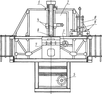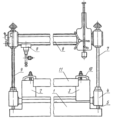 1 - стойка; 2 - испытуемое изделие; 3 - привод; 4 - рычаги-толкатели; 5 - гидробак; 6 - счетчик оборотов; 7 - пульт управления; 8 - нагружающее устройство, 9 - стопорное устройство. Черт. 1 Испытательная машина 2 (конструкции ВНИИдрева) Машина (черт 2) предназначена для испытания на сопротивление окон и балконных дверей нагрузке, действующей перпендикулярно плоскости створки, в том числе на запорные приборы и ручки. Окно или дверь помещают на опоры машины: неподвижную и подвижную, перемещаемую при настройке на ширину окна или двери. Коробку закрепляют на опорах. Настройка нагружающего устройства на заданную зону изделия производится путем перемещения каретки с траверсой по направляющим, а нагружающего устройства с силоизмерителем - по траверсе Нагружение и разгружение осуществляется при перемещении траверсы по колонкам. Управление всеми перемещениями - с пульта. Привод электромеханический. Техническая характеристика Габаритные размеры, мм: ширина ................................................................ 4105 длина ................................................................... 4630 высота ................................................................. 2915 Масса, кг ................................................................. 5400 Установленная мощность, кВт ............................. 4,1 Максимальная статическая нагрузка, кгс ............ 1000 Скорость перемещения нагружающего устройства, мм/мин .... 40 и 120 Скорость перемещения каретки, м/с .................... 0,15 Скорость перемещения опоры, м/с ...................... 0,04 1 - основание машины; 2 - неподвижная опора; 3 - подвижная опора; 4 - каретка; 5 - направляющая каретки; 6 - траверса; 7 - колонка для перемещения траверсы; 8 - датчик сил; 9 - измеритель перемещений; 10 - прижимы; 11 - испытуемое изделие Черт. 2 |