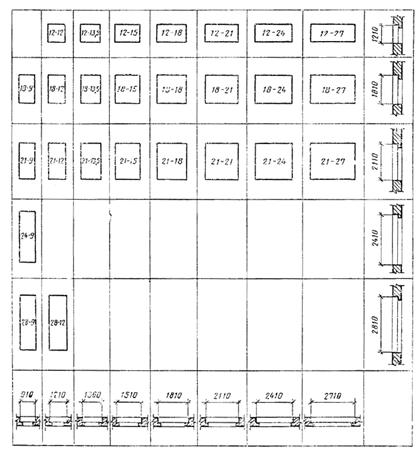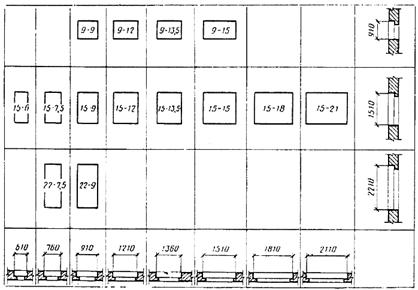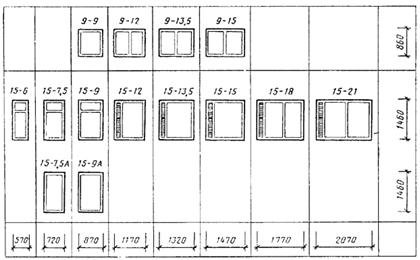 Примечания: 1. Схемы изделий изображены со стороны фасада. 2. Цифры над схемами изделий означают размеры проемов в модулях. 3. Окна талов 15—12; 15—13,5; 15—15; 15—18 и 15—21 — с клапанами. Черт. 1 Габаритные размеры окон и балконных дверей общественных зданий Окна